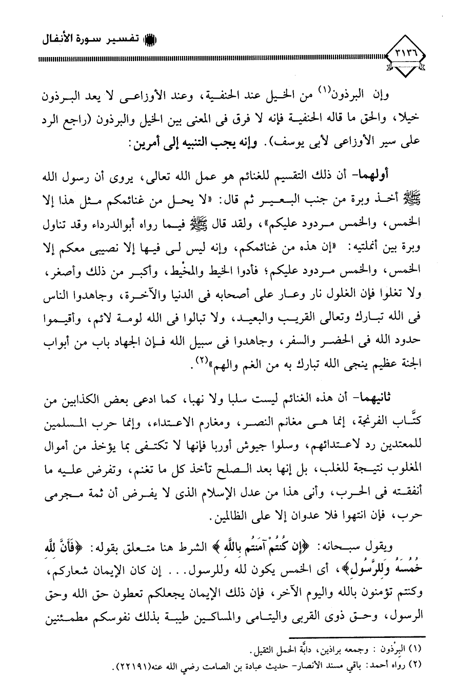 وإن البرذون (¬1) من الخيل عند الحنفية، وعند الأوزاعي لَا يعد البرذون خيلا، والحق ما قاله الحنفية فإنه لَا فرق في المعنى بين الخيل والبرذون (راجع الرد على سير الأوزاعي لأبي يوسف). وإنه يجب التنبيه إلى أمرين: أولهما - أن ذلك التقسيم للغنائم هو عمل الله تعالى، يروى أن رسول الله - صلى الله عليه وسلم - أخذ وبرة من جنب البعير ثم قال: " لا يحل من غنائمكم مثل هذا إلا الخمس، والخمس مردود عليكم "، ولقد قال - صلى الله عليه وسلم - فيما رواه أبوالدرداء وقد تناول وبرة بين أنملتيه: " إن هذه من غنائمكم، وإنه ليس لي فيها إلا نصيبي معكم إلا الخمس، والخمس مردود عليكم، فأدوا الخيط والمخْيط، وأكبر من ذلك وأصغر، ولا تغلوا فإن الغلول نار وعار على أصحابه في الدنيا والآخرة، وجاهدوا الناس في الله تبارك وتعالى القريب والبعيد، ولا تبالوا في الله لومة لائم، وأقيموا حدود الله في الحضر والسفر، وجاهدوا في سبيل الله فإن الجهاد باب من أبواب الجنة عظيم ينجي الله تبارك به من الغم والهم " (¬2).