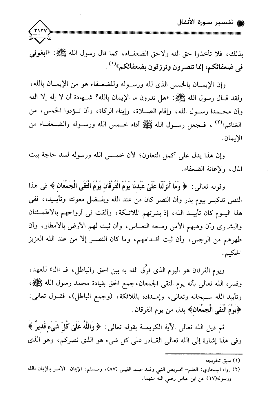 وقوله تعالى: (وَمَا أَنزَلْنَا عَلَى عَبْدِنَا يَوْمَ الْفُرْقَانِ يَوْمَ الْتَقَى الْجَمْعَانِ) في هذا النص تذكير بيوم بدر وأن النصر كان من عند الله وبفضل معونته وتأييده، ففي هذا اليوم كان تأييد الله، إذ بشرتهم الملائكة، وألقت في أرواحهم بالاطمئنان والبشرى وأن وهبهم الأمن ومعه النعاس، وأن ثبت لهم الأرض بالأمطار، وأن طهرهم من الرجس، وأن ثبت أقدامهم، وما كان النصر إلا من عند الله العزيز الحكيم.