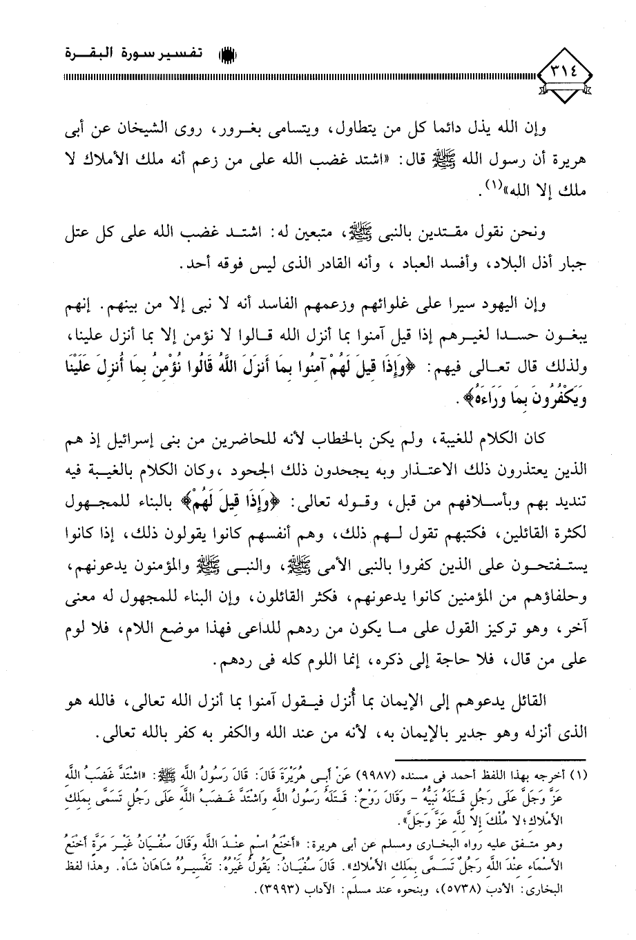 (¬1) أخرجه بهذا اللفظ أحمد في مسنده (9987) عَنْ أبي هُرَيْرَةَ قَالَ: قَالَ رَسُولُ اللَّه - صلى الله عليه وسلم -: " اشْتَدَّ غضَبُ الله عَزَّ وَجَلَّ عَلَى رَجُل قَتَلَهُ نَبيُّهُ - وَقَالَ رَوْحٌ: قَتَلَهُ رَسًولً اللَّهِ وَاشْتَدَّ غَضَبُ اللَّهَ عَلَى رَجُل تَسَمَّى بِمَلِكِ الأملاكِ؛ لَا مُلْكَ إِلا لِلَّه عًَز جَلَّ ".