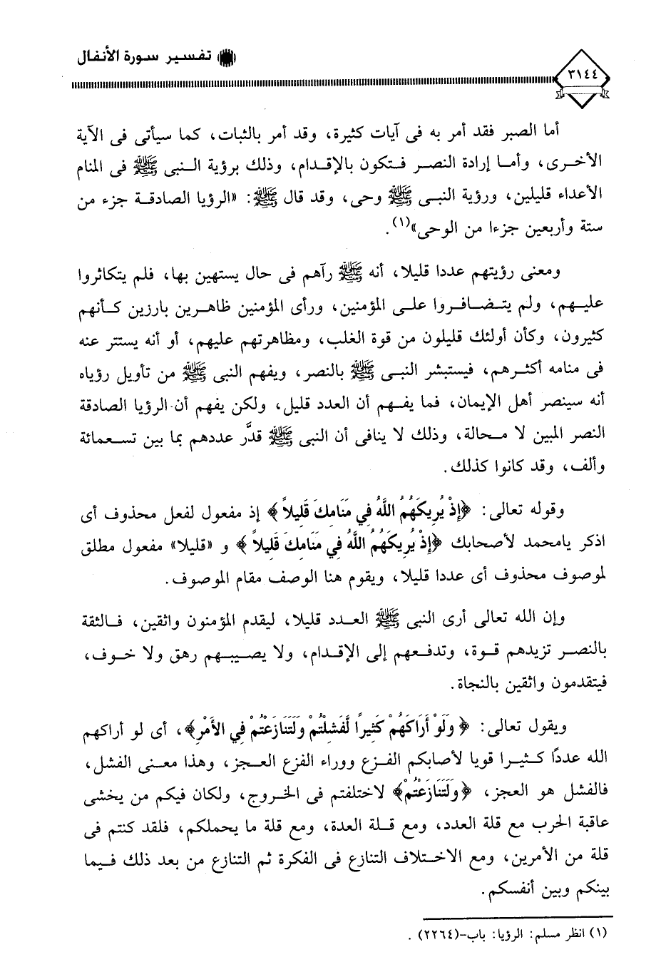 ويقول تعالى: (وَلَوْ أَرَاكهُمْ كَثِيرًا لَّفَشِلْتُمْ وَلَتَنَازَعْتمْ فِي الأَمْرِ)، أي لو أراكهم الله عددًا كثيرا قويا لأصاببهم الفزع ووراء الفزع العجز، وهذا معنى الفشل، فالفشل هو العجز، (وَلَتَنَازَعْتمْ) لاختلفتم في الخروج، ولكان فيكم من يخشى عاقبة الحرب مع قلة العدد، ومع قلة العدة، ومع قلة ما يحملكم، فلقد كنتم في قلة من الأمرين، ومع الاختلاف التنازع في الفكرة ثم التنازع من بعد ذلك فيما بينكم وبين أنفسكم.