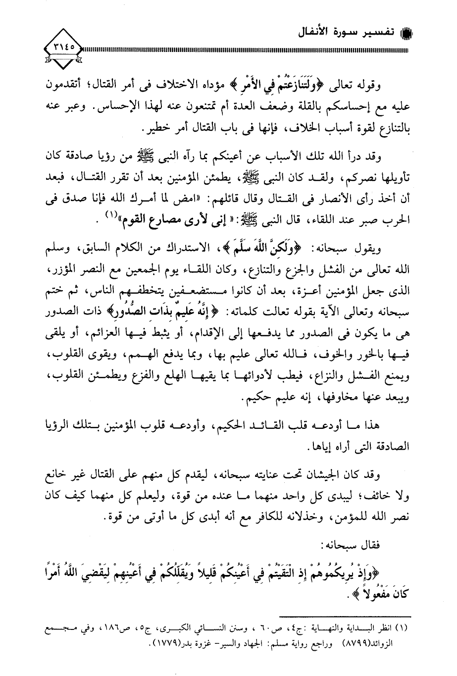 وقد درأ الله تلك الأسباب عن أعينكم بما رآه النبي - صلى الله عليه وسلم - من رؤيا صادقة كان تأويلها نصركم، ولقد كان النبي - صلى الله عليه وسلم -، يطمئن المؤمنين بعد أن تقرر القتال، فبعد أن أخذ رأى الأنصار في القتال وقال قائلهم: " امض لما أمرك الله فإنا صدق في الحرب صبر عند اللقاء، قال النبي - صلى الله عليه وسلم -: " إني لأرى مصارع القوم " (¬1).