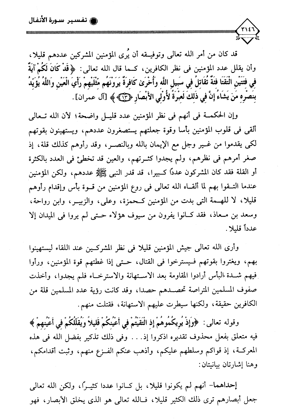 وإن الحكمة في أنهم في نظر المؤمنين عدد قليل واضحة، لأن الله تعالى ألقى في قلوب المؤمنين بأسا وقوة جعلتهم يستصغرون عددهم، ويستهينون بقوتهم لكي يقدموا من غير وجل مع الإيمان بالله وبالنصر، وقد رأوهم كذلك قلة، إذ صغر أمرهم في نظرهم، ولم يجدوا كثرتهم، والعين قد تخطئ في العدد بالكثرة أو القلة فقد كان المشركون عددًا كبيرا، قد قدر النبي - صلى الله عليه وسلم - عددهم، ولكن المؤمنين عندما التقوا بهم لما ألقاه الله تعالى في روع المؤمنين من قوة بأس وإقدام رأوهم قليلا، لَا للهمة التي بدت من المؤمنين كحمزة، وعلي، والزبير، وابن رواحة، وسعد بن معاذ، فقد كانوا يفرون من سيوف هؤلاء حتى لم يروا في الميدان إلا عدداً قليلا.