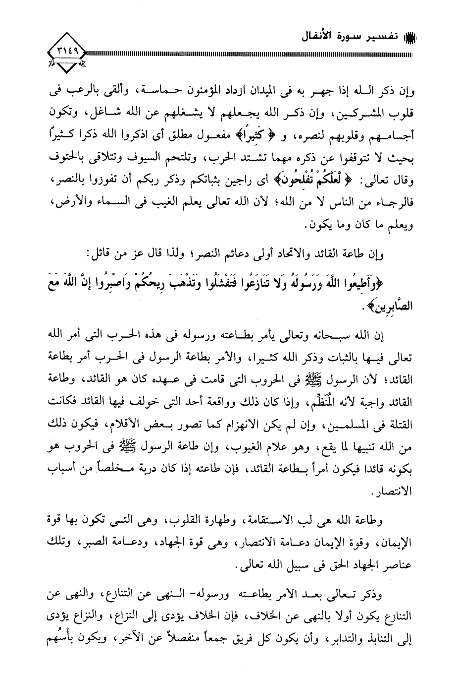 إن الله سبحانه وتعالى يأمر بطاعته ورسوله في هذه الحرب التي أمر الله تعالى فيها بالثبات وذكر الله كثيرا، والأمر بطاعة الرسول في الحرب أمر بطاعة القائد؛ لأن الرسول - صلى الله عليه وسلم - في الحروب التي قامت في عهده كان هو القائد، وطاعة القائد واجبة لأنه المُنَظِّم، وإذا كان ذلك وواقعة أحد التي خولف فيها القائد فكانت القتلة في المسلمين، وإن لم يكن الانهزام كما تصور بعض الأقلام، فيكون ذلك من الله تنبيها لما يقع، وهو علام الغيوب، وإن طاعة الرسول - صلى الله عليه وسلم - في الحروب هو بكونه قائدا فيكون أمراً بطاعة القائد، فإن طاعته إذا كان دربة مخلصا من أسباب الانتصار.