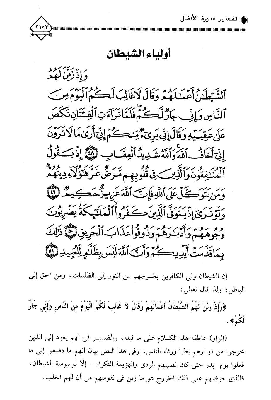 (وَإِذْ زَيَّنَ لَهُمُ الشَّيْطَانُ أَعْمَالَهُمْ وَقَالَ لَا غَالِبَ لَكُمُ الْيَوْمَ مِنَ النَّاسِ وَإِنِّي جَارٌ لَكُمْ فَلَمَّا تَرَاءَتِ الْفِئَتَانِ نَكَصَ عَلَى عَقِبَيْهِ وَقَالَ إِنِّي بَرِيءٌ مِنْكُمْ إِنِّي أَرَى مَا لَا تَرَوْنَ إِنِّي أَخَافُ اللَّهَ وَاللَّهُ شَدِيدُ الْعِقَابِ (48) إِذْ يَقُولُ الْمُنَافِقُونَ وَالَّذِينَ فِي قُلُوبِهِمْ مَرَضٌ غَرَّ هَؤُلَاءِ دِينُهُمْ وَمَنْ يَتَوَكَّلْ عَلَى اللَّهِ فَإِنَّ اللَّهَ عَزِيزٌ حَكِيمٌ (49) وَلَوْ تَرَى إِذْ يَتَوَفَّى الَّذِينَ كَفَرُوا الْمَلَائِكَةُ يَضْرِبُونَ وُجُوهَهُمْ وَأَدْبَارَهُمْ وَذُوقُوا عَذَابَ الْحَرِيقِ (50) ذَلِكَ بِمَا قَدَّمَتْ أَيْدِيكُمْ وَأَنَّ اللَّهَ لَيْسَ بِظَلَّامٍ لِلْعَبِيدِ (51)