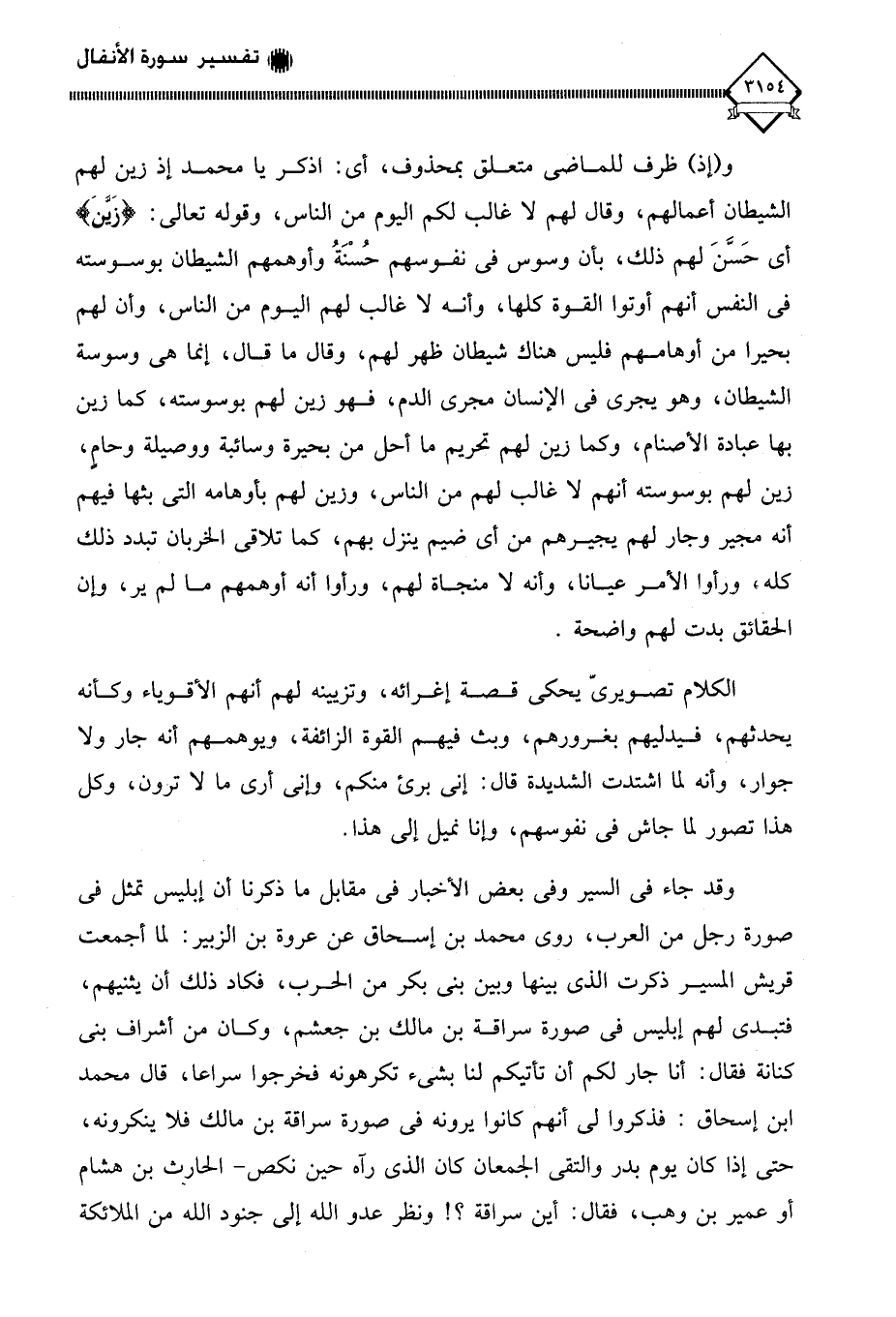وقد جاء في السير وفي بعض الأخبار في مقابل ما ذكرنا أن إبليس تمثل في صورة رجل من العرب، روى محمد بن إسحاق عن عروة بن الزبير: لما أجمعت قريش المسير ذكرت الذي بينها وبين بني بكر من الحرب، فكاد ذلك أن يثنيهم، فتبدى لهم إبليس في صورة سراقة بن مالك بن جعشم، وكان من أشراف بني كنانة فقال: أنا جار لكم أن تأتيكم لنا بشيء تكرهونه فخرجوا سراعا، قال محمد ابن إسحاق: فذكروا لي أنهم كانوا يرونه في صورة سراقة بن مالك فلا ينكرونه، حتى إذا كان يوم بدر والتقى الجمعان كان الذي رآه حين نكص - الحارث بن هشام أو عمير بن وهب، فقال: أين سراقة؟! ونظر عدو الله إلى جنود الله من الملائكة