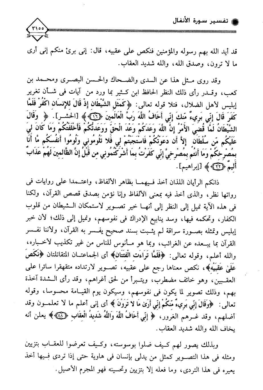 ذانكم الرأيان اللذان أخذ فيهما بظاهر الألفاظ، واعتمدا على روايات في رواتها نظر، والذي أخذ فيه بمعنى الألفاظ وإنا نؤمن بصدق قصص القرآن، ولكنا في هذه الآية نميل إلى النظر إلى أنها خير تصوير لاستمكان الشيطان من قلوب الكفار، وتحكمه فيها، وسد ينابيع الإدراك في نفوسهم، ونميل إلى ذلك؛ لأن خبر إبليس وتمثله بصورة سراقة لم يثبت بسند صحيح يفسر به القرآن، ولأننا نفسر القرآن بما يبعده عن الغرائب، وبما هو مأنوس للناس من غير تكذيب لأخباره، والله أعلم، وقوله تعالى: (فَلَمَّا ترَاءَتِ الْفِئَتانِ) أي الجماعتان المتقاتلتان (نَكَصَ عَلَى عَقبَيْه)، نكص معناها رجع على عقبيه، تصوير لارتداده متقهقرا سائرا على العقبينَ، وهو خائف مضطرب، ويتبرأ من لحق أغراهم، وقد رأى الشدة آخذة بهم، وذلك تصوير لما يكون في نفوسهم، وسيكون يوم القيامة محسوسا، وقوله تعالى: (وَقَالَ إِنِّي بَرِيءٌ مِّنكُمْ إِنِّي أَرَى مَا لَا تَرَوْنَ) أي إني أعلم ما لَا تعلمون وقد أضلهم، وقد غرهم الغرور، (إِنِّي أَخَافُ اللَّهَ وَاللَّهُ شَدِيدُ الْعِقَابِ) يعلن أنه يخاف الله والله شديد العقاب.
