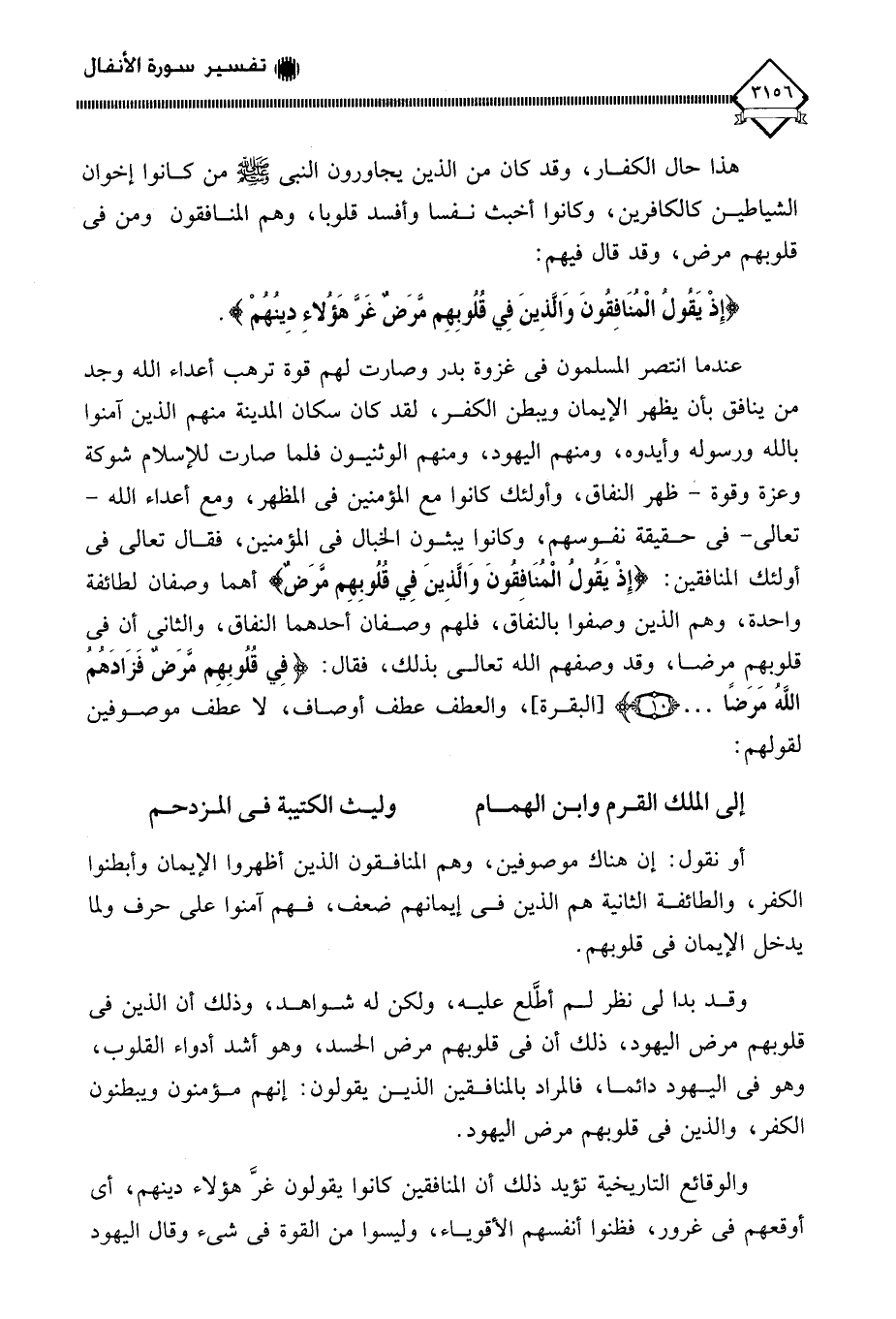 إلى الملك القرم وابن الهمام وليث الكتيبة في المزدحم أو نقول: إن هناك موصودين، وهم المنافقون الذين أظهروا الإيمان وأبطنوا الكفر، والطائفة الثانية هم الذين في إيمانهم ضعف، فهم آمنوا على حرف ولما يدخل الإيمان في قلوبهم.