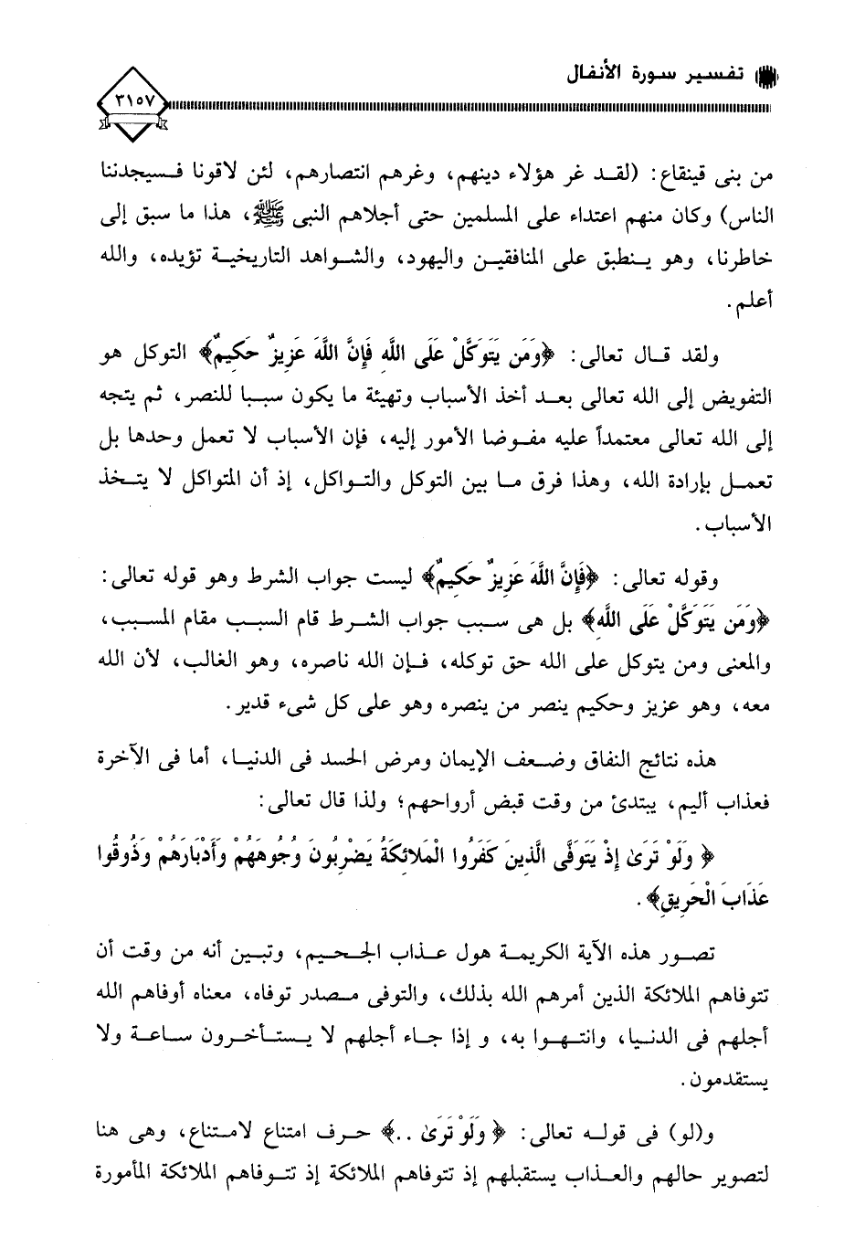 ولقد قال تعالى: (وَمَن يَتَوَكَّلْ عَلَى اللَّهِ فَإِنَّ اللَّهَ عَزِيزٌ حَكِيمٌ) التوكل هو التفويض إلى الله تعالى بعد أخذ الأسباب وتهيئة ما يكون سببا للنصر، ثم يتجه إلى الله تعالى معتمداً عليه مفوضا الأمور إليه، فإن الآسباب لَا تعمل وحدها بل تعمل بإرادة الله، وهذا فرق ما بين التوكل والتواكل، إذ أن المتواكل لَا يتخذ الأسباب.