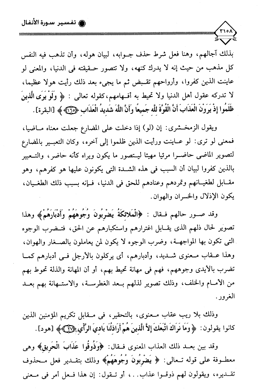 بذلك آجالهم، وهنا فعل شرط حذف جوابه، لبيان هوله، وأن تذهب فيه النفس كل مذهب من حيث إنه لَا يدرك كنهه، ولا تتصور حقيقته في الدنيا، والمعنى لو عاينت الذين كفروا، وأرواحهم تقبض ثم ما يجيء بعد ذلك رأيت هولا عظيما، لا تدركه عقول أهل الدنيا ولا تحيط به أفهامهم، كقوله تعالى: (وَلَوْ يَرَى الَّذِينَ ظَلَمُوا إِذْ يَرَوْنَ الْعَذَابَ أَنَّ الْقُوَّةَ لِلَّهِ جَمِيعًا وَأَنَّ اللَّهَ شَدِيدُ الْعَذَابِ).