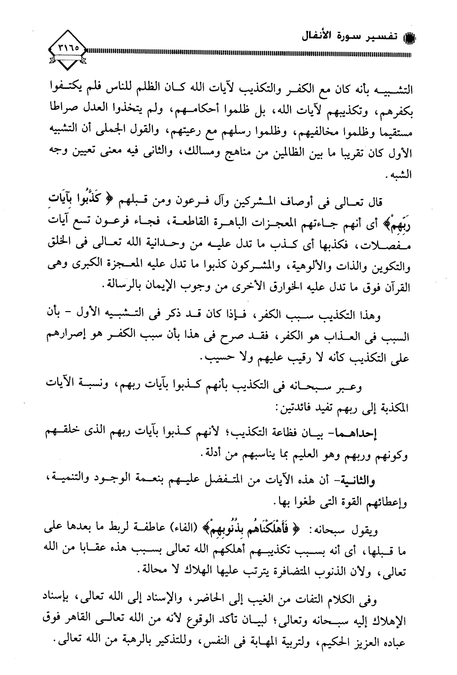 قال تعالى في أوصاف المشركين وآل فرعون ومن قبلهم (كذَّبُوا بِآيَاتِ رَبِّهِمْ) أي أنهم جاءتهم المعجزات الباهرة القاطعة، فجاء فرعون تسع آيات مفصلات، فكذبها أي كذب ما تدل عليه من وحدانية الله تعالى في الخلق والتكوين والذات والألوهية، والمشركون كذبوا ما تدل عليه المعجزة الكبرى وهي القرآن فوق ما تدل عليه الخوارق الأخرى من وجوب الإيمان بالرسألة.