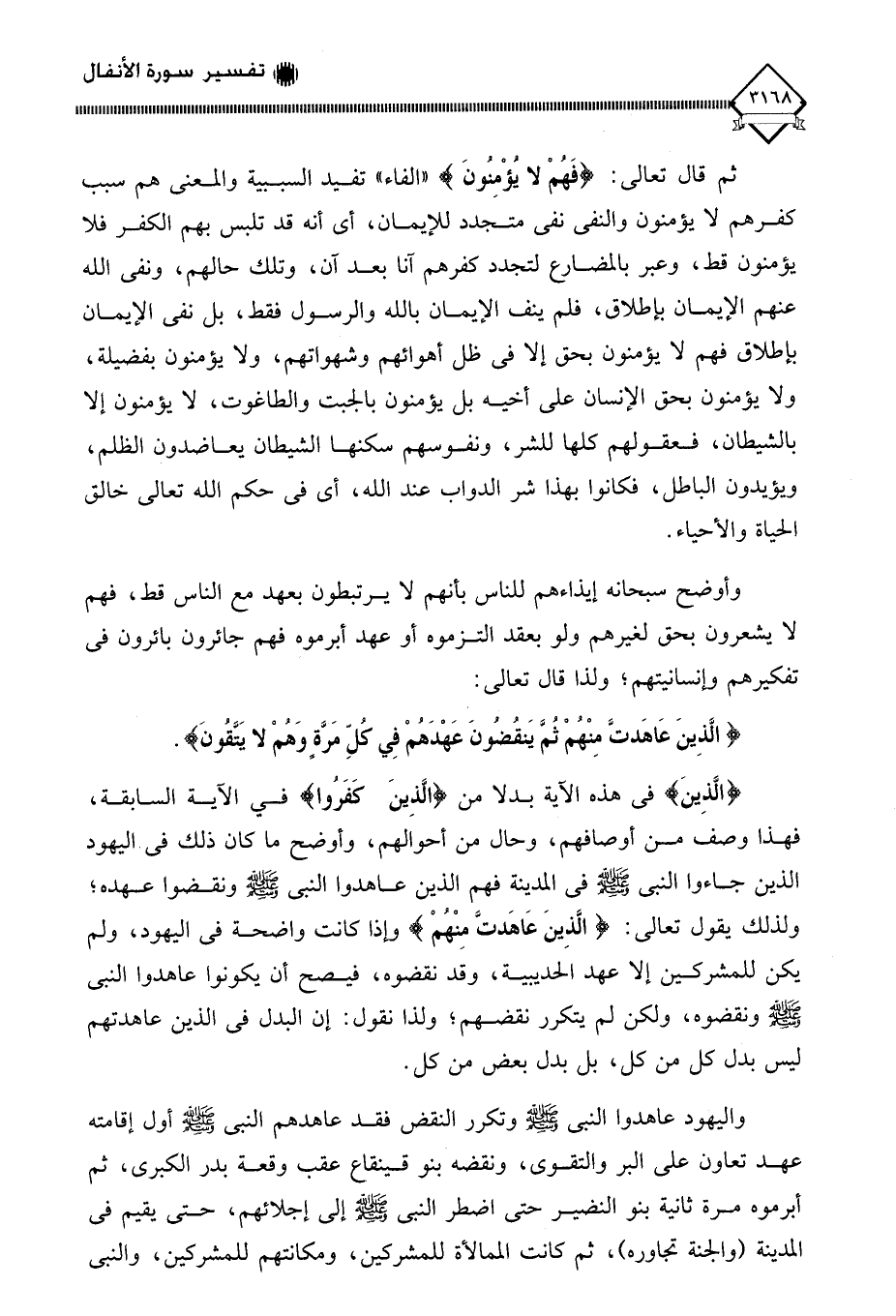 (الَّذِينَ) في هذه الآية بدلا من (الَّذِينَ كَفَرُوا) في الآية السابقة، فهذا وصف من أوصافهم، وحال من أحوالهم، وأوضح ما كان ذلك في. اليهود الذين جاءوا النبي - صلى الله عليه وسلم - في المدينة فهم الذين عاهدوا النبي - صلى الله عليه وسلم - ونقضوا عهده؛ ولذلك يقول تعالى: (الَّذِينَ عَاهَدتَّ مِنْهُمْ) وإذا كانت واضحة في اليهود، ولم يكن للمشركين إلا عهد الحديبية، وقد نقضوه، فيصح أن يكونوا عاهدوا النبي - صلى الله عليه وسلم - ونقضوه، ولكن لم يتكرر نقضهم؛ ولذا نقول: إن البدل في الذين عاهدتهم ليس بدل كل من كل، بل بدل بعض من كل.