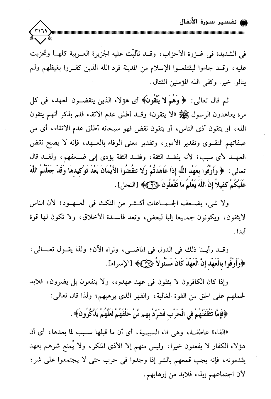 ثم قال تعالى: (وَهُمْ لَا يَتَّقُونَ) أي هؤلاء الذين ينقضون العهد، في كل مرة يعاهدون الرسول - صلى الله عليه وسلم - (لا يتقون) وقد أطلق عدم الاتقاء فلم يذكر أنهم يتقون الله، أو يتقون أذى الناس، أو يتقون نقض فهو سبحانه أطلق عدم الاتقاء، أي من صفاتهم التقوى وتقدير الأمور، وتقدير معنى الوفاء بالعهد، فإنه لَا يصح نقض العهد لأي سبب؛ لأنه يفقد الثقة، وفقد الثقة يؤدي إلى ضعفهم، ولقد قال تعالى: (وَأَوْفُوا بِعَهْدِ اللَّهِ إِذَا عَاهَدْتُمْ وَلَا تَنْقُضُوا الْأَيْمَانَ بَعْدَ تَوْكِيدِهَا وَقَدْ جَعَلْتُمُ اللَّهَ عَلَيْكُمْ كَفِيلًا إِنَّ اللَّهَ يَعْلَمُ مَا تَفْعَلُونَ (91).