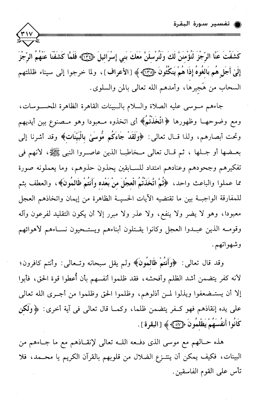 (وَلَقَدْ جَاءَكُم مُّوسَى بِالْبَيِّنَاتِ) وقد أشرنا إلى بعضها أو جلها، ثم قال تعالى مخاطبا الذين عاصروا النبي - صلى الله عليه وسلم -، لأنهم في تفكيرهم وجحودهم وعنادهم امتداد للسابقين يحذون حذوهم، وما يعملونه صورة مما عملوا والباعث واحد، (ثُمَّ اتَّخَذْتُمُ الْعِجْلَ مِنْ بَعْدِهِ وَأَنتُمْ ظَالِمُونَ)، والعطف بثم للمفارقة الواجبة بين ما تقتضيه الآيات الحسية الظاهرة من إيمان واتخاذهم العجل معبودا، وهو لَا يضر ولا ينفع، ولا عذر ولا مبرر إلا أن يكون التقليد لفرعون وآله وقومه الذين عبدوا العجل وكانوا يقتلون أبناءهم ويستحيون نساءهم لأهوائهم وشهواتهم.