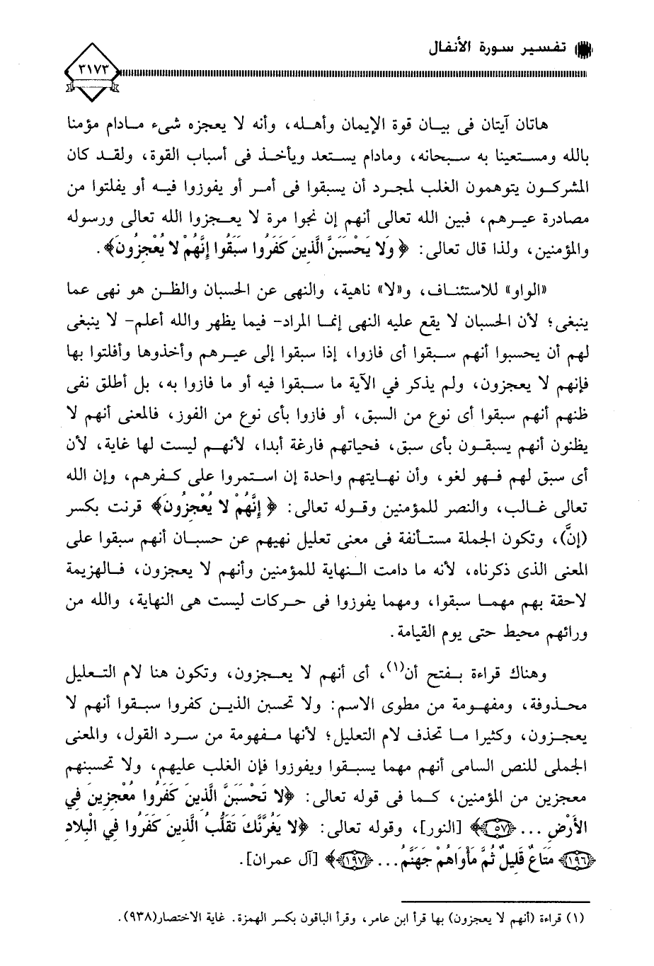 وهناك قراءة بفتح أن (¬1)، أي أنهم لَا يعجزون، وتكون هنا لام التعليل محذوفة، ومفهومة من مطوى الاسم: ولا تحسبن الذين كفروا سبقوا أنهم لا يعجزون، وكثيرا ما تحذف لام التعليل، لأنها مفهومة من سرد القول، والمعنى الجملي للنص السامي أنهم مهما يسبقوا ويفوزوا فإن الغلب عليهم، ولا تحسبنهم معجزين من المؤمنين، كما في قوله تعالى: (لا تَحْسَبَنَّ الَّذِينَ كَفَروا معْجِزِينَ فِي الأَرْضِ. . .)، وقوله تعالى: (لَا يَغُرَّنَّكَ تَقَلُّبُ الَّذِينَ كَفَرُوا فِي الْبِلَادِ (196) مَتَاعٌ قَلِيلٌ ثُمَّ مَأْوَاهُمْ جَهَنَّمُ ... ).