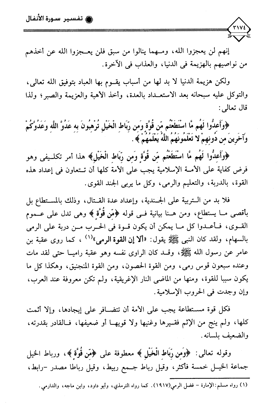 فلا بد من التربية على الجندية، وإعداد عدة القتال، وذلك بالمستطاع بل بأقصى ما يستطاع، ومن هنا بيانية في قوله (مِّن قُوَّةٍ) وهي تدل على عموم القوى، فأعدوا كل ما يمكن أن يكون قوة في الحرب من دربة على الرمي بالسهام، ولقد كان النبي - صلى الله عليه وسلم - يقول: " ألا إن القوة الرمي " (¬1)، كما روى عقبة بن عامر عن رسول الله - صلى الله عليه وسلم -، وقد كان الراوي نفسه وهو عقبة راميا حتى لقد مات وعنده سبعون قوس رمي، ومن القوة الحصون، ومن القوة المنجنيق، وهكذا كل ما يكون سببا للقوة، ومنها من الماضي النار الإغريقية، ولم تكن معروفة عند العرب، وإن وجدت في الحروب الإسلامية.