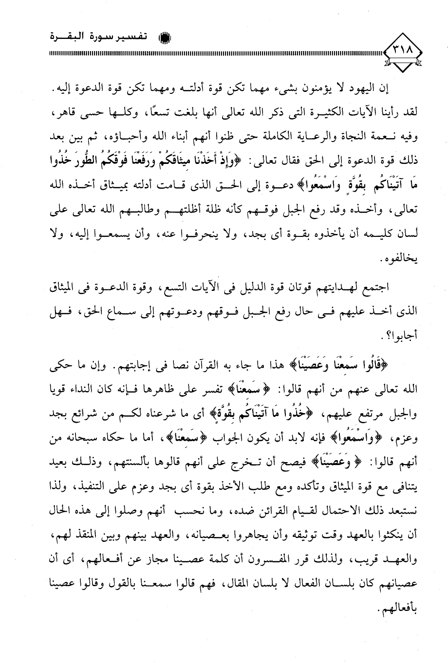 (قَالُوا سَمِعْنَا وَعَصَيْنَا) هذا ما جاء به القرآن نصا في إجابتهم. وإن ما حكى الله تعالى عنهم من أنهم قالوا: (سَمِعْنَا) تفسر على ظاهرها فإنه كان النداء قويا والجبل مرتفع عليهم، (خُذُوا مَا آتَيْنَاكُم بِقُوَّة) أي ما شرعناه لكم من شرائع بجد وعزم، (وَاسْمَعُوا) فإنه لابد أن يكون الجواب (سَمِعْنَا)، أما ما حكاه سبحانه من أنهم قالوا: (وَعَصَيْنَا) فيصح أن تخرج على أنهم قالوها بألسنتهم، وذلك بعيد يتنافى مع قوة الميثاق وتأكده ومع طلب الأخذ بقوة أي بجد وعزم على التنفيذ، ولذا نستبعد ذلك الاحتمال لقيام القرائن ضده، وما نحسب أنهم وصلوا إلى هذه الحال أن ينكثوا بالعهد وقت توثيقه وأن يجاهروا بعصيانه، والعهد بينهم وبين المنقذ لهم، والعهد قريب، ولذلك قرر المفسرون أن كلمة عصينا مجاز عن أفعالهم، أي أن عصيانهم كان بلسان الفعال لَا بلسان المقال، فهم قالوا سمعنا بالقول وقالوا عصينا بأفعالهم.