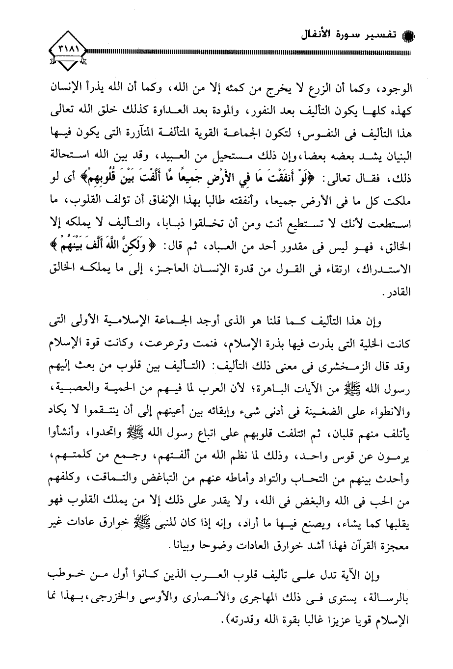 وإن الآية تدل على تأليف قلوب العرب الذين كانوا أول من خوطب بالرسالة، يستوي في ذلك المهاجري والأنصاري والأوسي والخزرجي، بهذا نما الإسلام قويا عزيزا غالبا بقوة الله وقدرته).