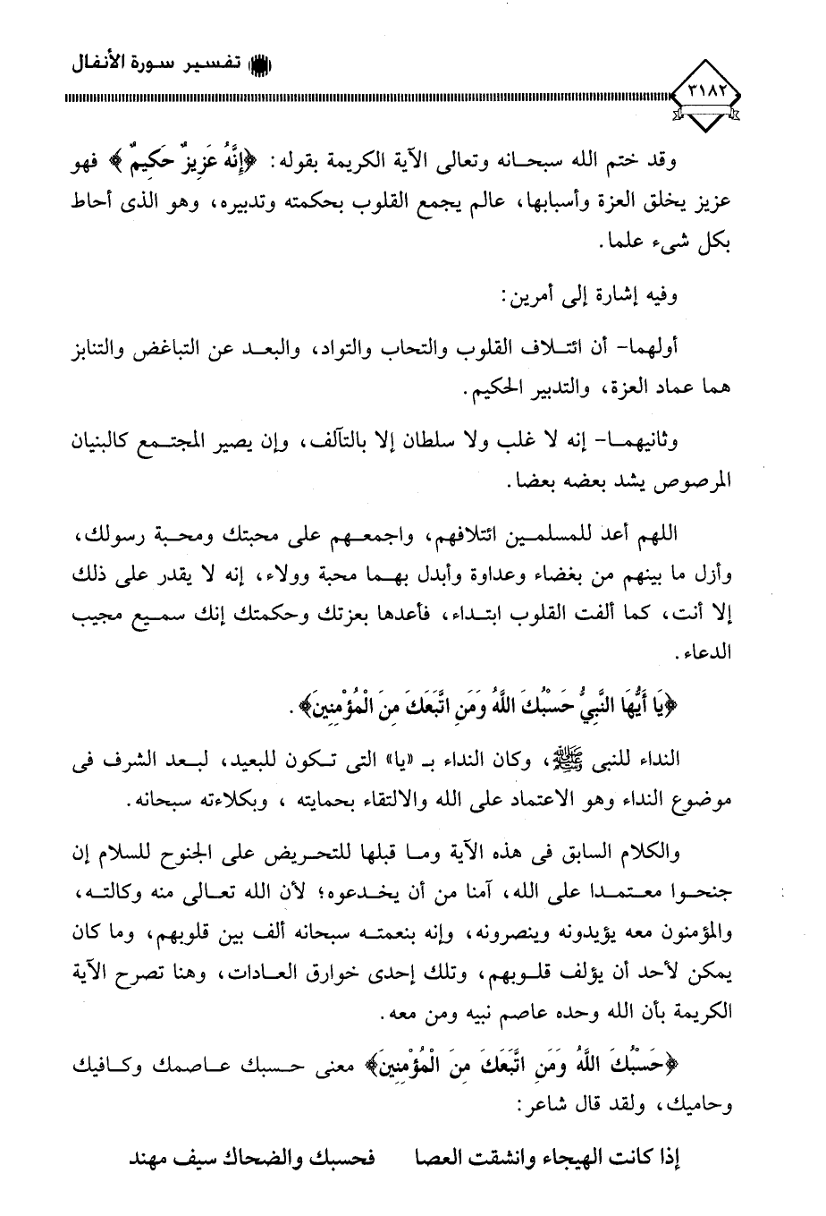 (حَسْبُكَ اللَّهُ وَمَنِ اتَبَعَكَ مِنَ الْمُؤْمِنِينَ) معنى حسبك عاصمك وكافيك وحاميك، ولقد قال شاعر: