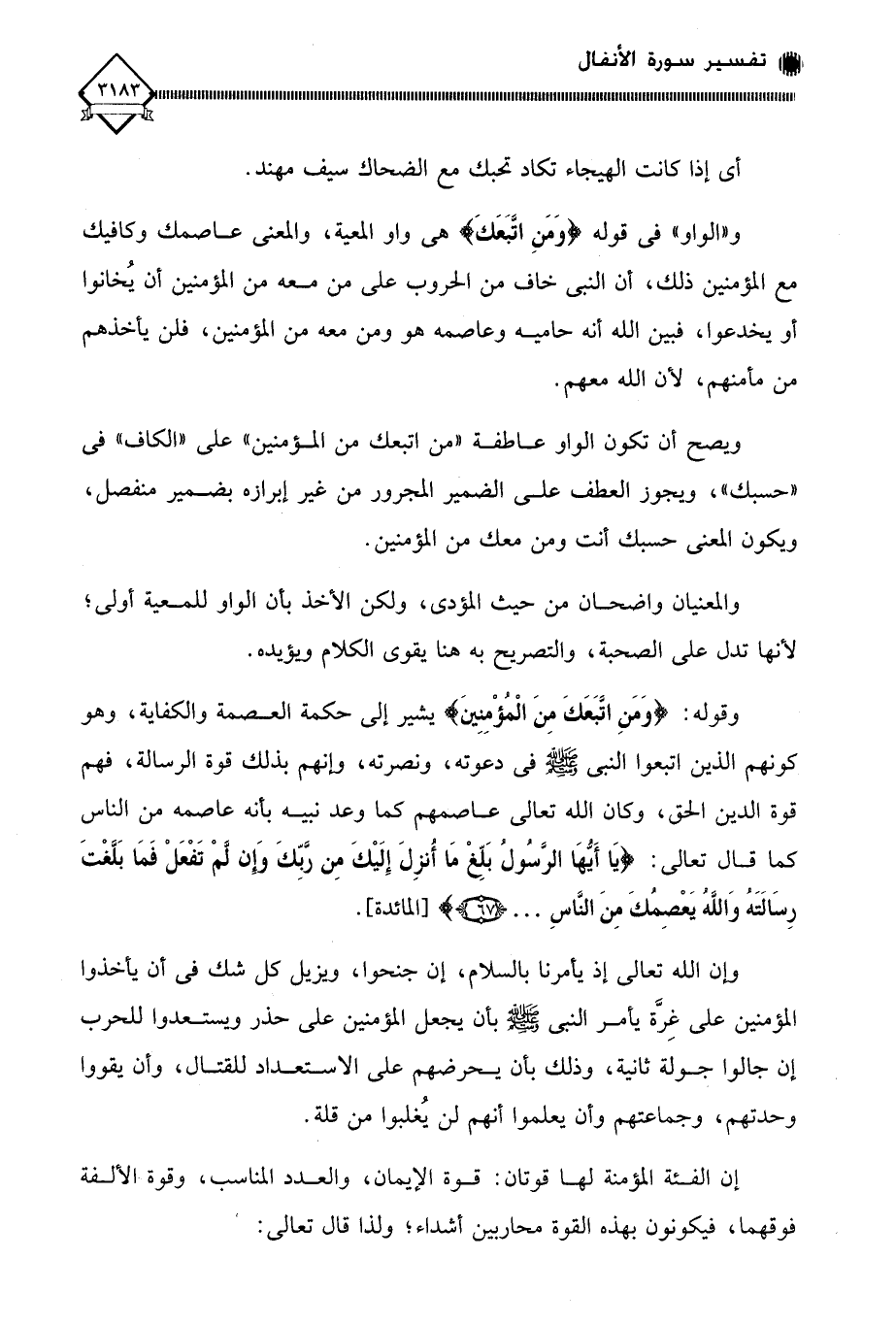 وقوله: (وَمَنِ اتَبَعَكَ مِنَ الْمُؤْمِنِينَ) يشير إلى حكمة العصمة والكفاية، وهو كونهم الذين اتبعوا النبي - صلى الله عليه وسلم - في دعوته، ونصرته، وإنهم بذلك قوة الرسالة، فهم قوة الدين الحق، وكان الله تعالى عاصمهم كما وعد نبيه بأنه عاصمه من الناس كما قال تعالى: (يَا أَيُّهَا الرَّسُولُ بَلِّغْ مَا أُنْزِلَ إِلَيْكَ مِنْ رَبِّكَ وَإِنْ لَمْ تَفْعَلْ فَمَا بَلَّغْتَ رِسَالَتَهُ وَاللَّهُ يَعْصِمُكَ مِنَ النَّاسِ. . .).
