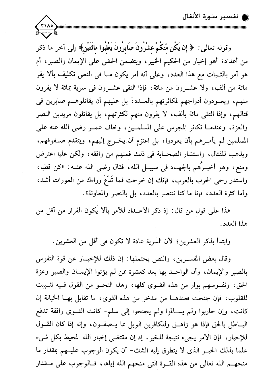 وقوله تعالى: (إِن يَكُن مِّنكُمْ عِشْرُونَ صَابِرُونَ يَغْلِبُوا مِائَتَيْنِ) إلى آخر ما ذكر من أعداد؛ أهو إخبار من الحكيم الخبير، ويتضمن الحض على الإيمان والصبر، أم هو أمر بالثبات مع هذا العدد، وعلى أنه أمر يكون ما في النص تكليف بألا يفر مائة من ألف، ولا عشرون من مائة، فإذا التقى عشرون في سرية بمائة لَا يفرون منهم، ويعودون أدراجهم لمكاثرتهم بالعدد، بل عليهم أن يقاتلوهم صابرين في قتالهم، وإذا التقى مائة بألف، لَا يفرون منهم لكثرتهم، بل يقاتلون مريدين النصر والعزة، وعندما تكاثر المجوس على المسلمين، وخاف عمر رضي الله عنه على المسلمين لم يأمرهم بأن يعودوا، بل اعتزم أن يخرج إليهم، ويتقدم صفوفهم، ويذهب للقتال، واستشار الصحابة في ذلك فمنهم من وافقه، ولكن عليا اعترض ومنع، وهو أخبرُهم بالجهاد في سبيل الله، فقال رضي الله عنه: " كن قطبا، واستدر رحى الحرب بالعرب، فإنك إن خرجت فما تَدع وراءك من العورات أشد، وأما كثرة العدد، فإنا ما كنا ننتصر بالعدد، بل بالنصر والمعاونة ".