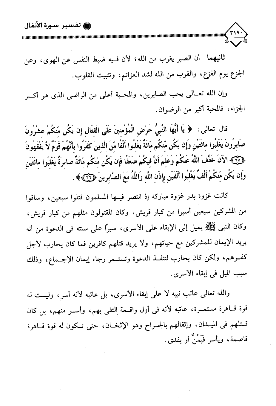 قال تعالى: (يَا أَيُّهَا النَّبِيُّ حَرِّضِ الْمُؤْمِنِينَ عَلَى الْقِتَالِ إِنْ يَكُنْ مِنْكُمْ عِشْرُونَ صَابِرُونَ يَغْلِبُوا مِائَتَيْنِ وَإِنْ يَكُنْ مِنْكُمْ مِائَةٌ يَغْلِبُوا أَلْفًا مِنَ الَّذِينَ كَفَرُوا بِأَنَّهُمْ قَوْمٌ لَا يَفْقَهُونَ (65) الْآنَ خَفَّفَ اللَّهُ عَنْكُمْ وَعَلِمَ أَنَّ فِيكُمْ ضَعْفًا فَإِنْ يَكُنْ مِنْكُمْ مِائَةٌ صَابِرَةٌ يَغْلِبُوا مِائَتَيْنِ وَإِنْ يَكُنْ مِنْكُمْ أَلْفٌ يَغْلِبُوا أَلْفَيْنِ بِإِذْنِ اللَّهِ وَاللَّهُ مَعَ الصَّابِرِينَ (66).