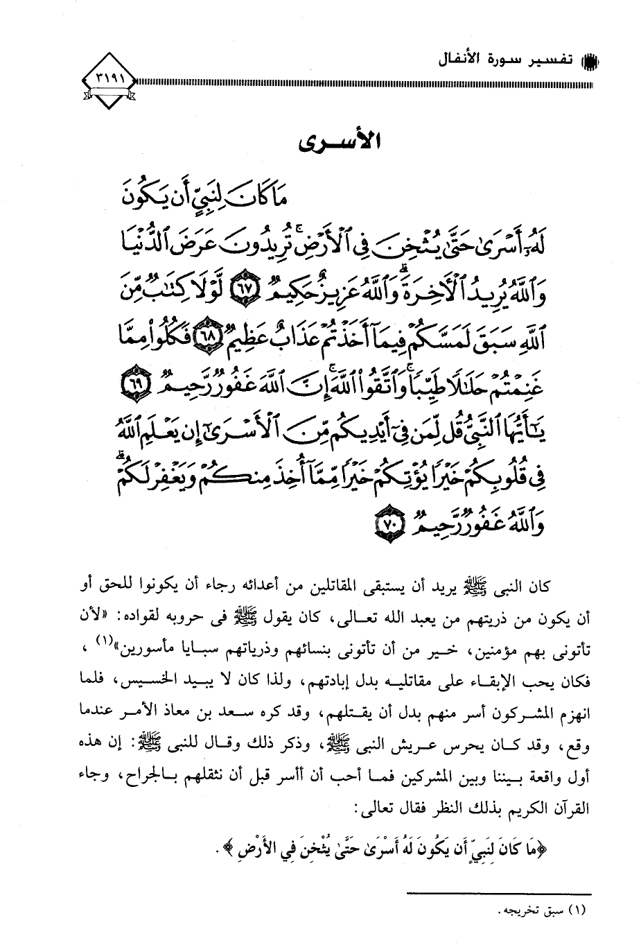 (مَا كَانَ لِنَبِيٍّ أَنْ يَكُونَ لَهُ أَسْرَى حَتَّى يُثْخِنَ فِي الْأَرْضِ تُرِيدُونَ عَرَضَ الدُّنْيَا وَاللَّهُ يُرِيدُ الْآخِرَةَ وَاللَّهُ عَزِيزٌ حَكِيمٌ (67) لَوْلَا كِتَابٌ مِنَ اللَّهِ سَبَقَ لَمَسَّكُمْ فِيمَا أَخَذْتُمْ عَذَابٌ عَظِيمٌ (68) فَكُلُوا مِمَّا غَنِمْتُمْ حَلَالًا طَيِّبًا وَاتَّقُوا اللَّهَ إِنَّ اللَّهَ غَفُورٌ رَحِيمٌ (69) يَا أَيُّهَا النَّبِيُّ قُلْ لِمَنْ فِي أَيْدِيكُمْ مِنَ الْأَسْرَى إِنْ يَعْلَمِ اللَّهُ فِي قُلُوبِكُمْ خَيْرًا يُؤْتِكُمْ خَيْرًا مِمَّا أُخِذَ مِنْكُمْ وَيَغْفِرْ لَكُمْ وَاللَّهُ غَفُورٌ رَحِيمٌ (70)