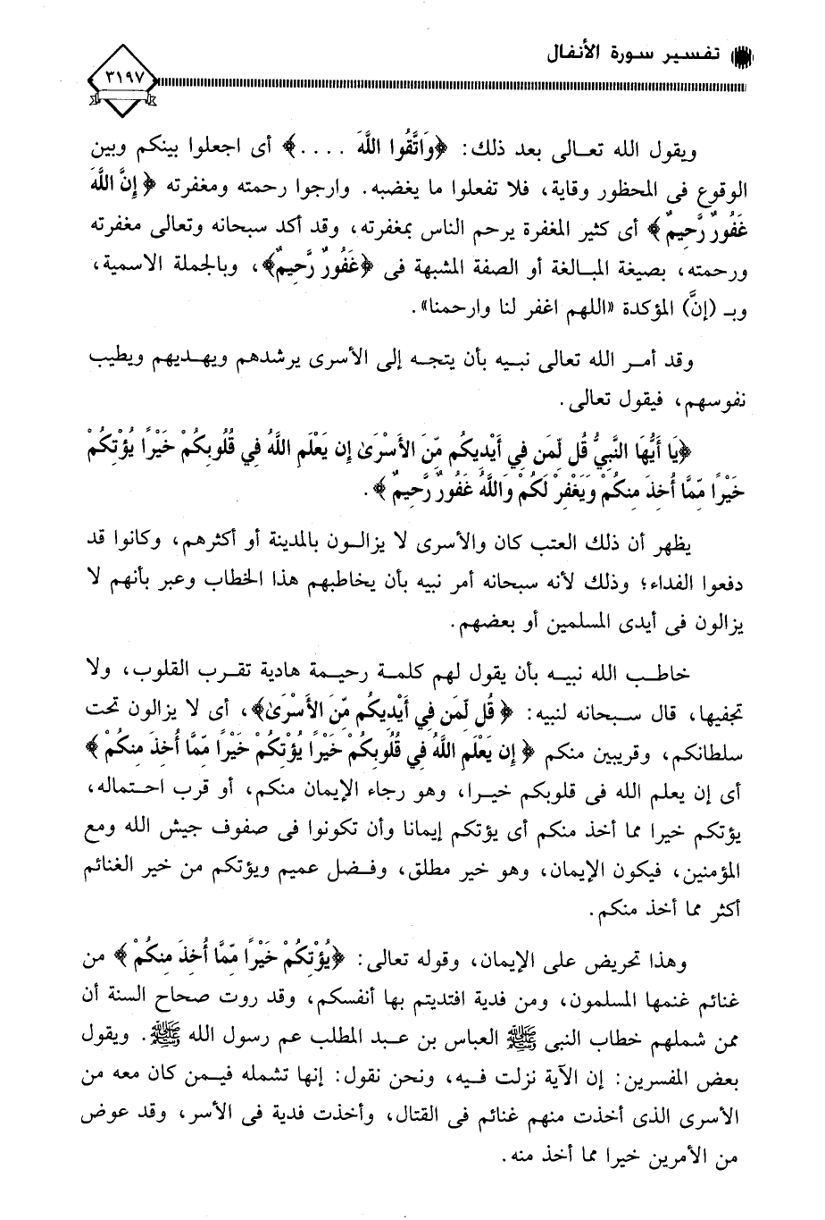 خاطب الله نبيه بأن يقول لهم كلمة رحيمة هادية تقرب القلوب، ولا تجفيها، قال سبحانه لنبيه: (قُل لِّمَن فِي أَيْدِيكُم مِّنَ الأَسْرَى)، أي لَا يزالون تحت سلطانكم، وقريبين منكم (إِن يَعْلَم اللَّهُ فِي قُلُوبِكُمْ خَيْرًا يؤْتكُمْ خَيْرًا مِّمَّا أُخِذَ مِنكمْ) أي إن يعلم الله في قلوبكم خيرا، وهو رجاء الإيمان منكم، أو قرب احتماله، يؤتكم خيرا مما أخذ منكم أي يؤتكم إيمانا وأن تكونوا في صفوف جيش الله ومع المؤمنين، فيكون الإيمان، وهو خير مطلق، وفضل عميم ويؤتكم من خير الغنائم أكثر مما أخذ منكم.