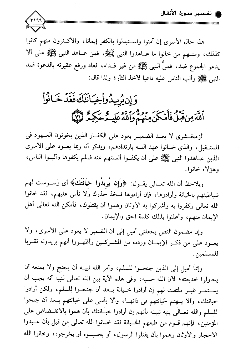 ويلاحظ أن الله تعالى يقول: (وَإِنْ يُرِيدُوا خِيَانَتَكَ) أي وسوست لهم شياطينهم بالخيانة وأرادوها، فإن أرادوها فخذ حذرك وَلا تأس عليهم، فقد خانوا الله تعالى وكفروا به وأشركوا به الأوثان وهموا أن يقتلوك، فأمكن الله تعالى أهل الإيمان منهم، وأعلنوا بذلك كلمة الحق والإيمان.