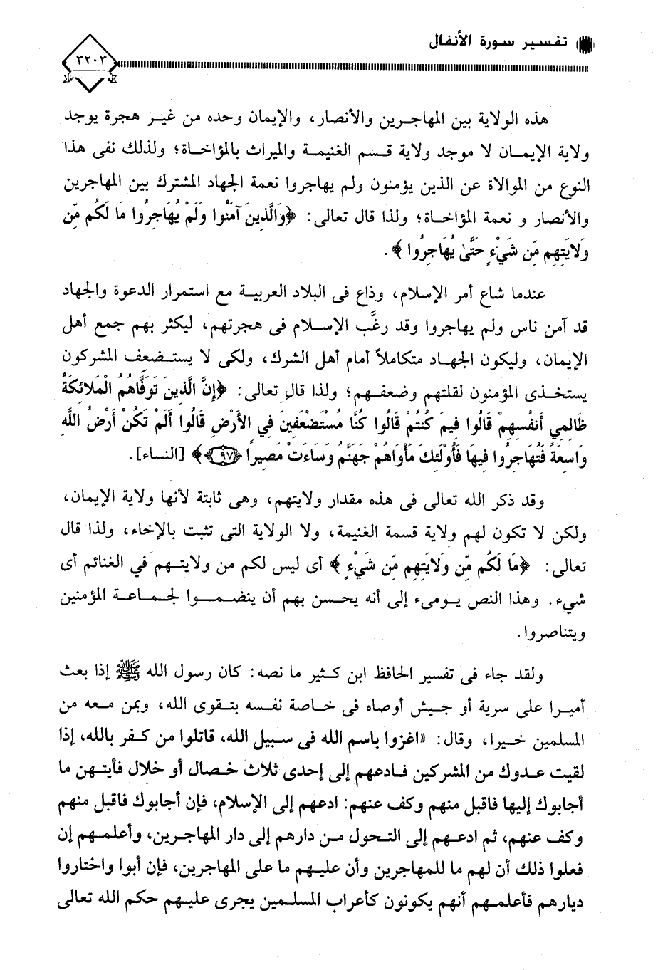 ولقد جاء في تفسير الحافظ ابن كثير ما نصه: كان رسول الله - صلى الله عليه وسلم - إذا بعث أميرا على سرية أو جيش أوصاه في خاصة نفسه بتقوى الله، وبمن معه من المسلمين خيرا، وقال: " اغزوا باسم الله في سبيل الله، قاتلوا من كفر بالله، إذا لقيت عدوك من المشركين فادعهم إلى إحدى ثلاث خصال أو خلال فأيتهن ما أجابوك إليها فاقبل منهم وكف عنهم: ادعهم إلى الإسلام، فإن أجابوك فاقبل منهم وكف عنهم، ثم ادعهم إلى التحول من دارهم إلى دار المهاجرين، وأعلمهم إن فعلوا ذلك أن لهم ما للمهاجرين وأن عليهم ما على المهاجرين، فإن أبوا واختاروا ديارهم فأعلمهم أنهم يكونون كأعراب المسلمين يجري عليهم حكم الله تعالى