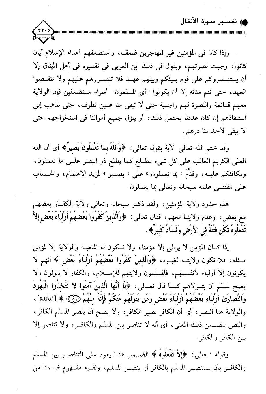 إذا كان المؤمن لَا يوالي إلا مؤمنا، ولا تكون له المحبة والولاية إلا لمؤمن مثله، فلا تكون ولايته لغيره، (وَالَّذِينَ كَفَرُوا بَعْضُهُمْ أَوْلِيَاءُ بَعْضٍ) أنهم لا يكونون إلا أولياء لأنفسهم، فالمسلمون ولايتهم للإسلام، والكفار لَا يتولون ولا يصح لمسلم أن يتولاهم كما قال تعالى: (يَا أَيُّهَا الَّذِينَ آمَنُوا لَا تَتَّخِذُوا الْيَهُودَ وَالنَّصَارَى أَوْلِيَاءَ بَعْضُهُمْ أَوْلِيَاءُ بَعْضٍ وَمَنْ يَتَوَلَّهُمْ مِنْكُمْ فَإِنَّهُ مِنْهُمْ)، والولاية هنا النصر، أي أن الكافر نصير الكافر، ولا يصح أن ينصر المسلم الكافر، والنص يتضمن ذلك المعنى، أي أنه لَا تناصر بين المسلم والكافر، ولا تناصر إلا بين الكافر والكافر.