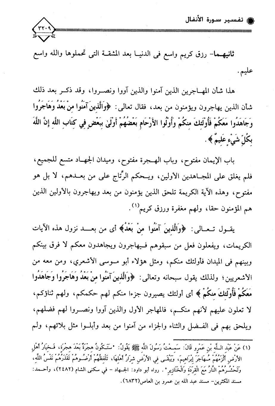 يقول تعالى: (وَالَّذِينَ آمَنُوا مِنْ بَعْدُ) أي من بعد نزول هذه الآيات الكريمات، ويفعلون فعل من سبقوهم فيهاجرون ويجاهدون معكم لَا فرق بينكم وبينهم في الميدان فأُولئك منكم، ومثل هؤلاء أبو موسى الأشعري، ومن معه من الأشعريين، ولذلك يقول سبحانه وتعالى: (وَالَّذِينَ آمَنُوا مِنْ بَعْدُ وَهَاجَرُوا وَجَاهَدُوا مَعَكُمْ فَأُولَئِكَ مِنكُمْ) أي أولئك يصيرون جزءا منكم لهم حكمكم، ولهم ثناؤكم، لا تعلون عليهم لأنهم منكم، فالمهاجر الأول والذين آووا ونصروا لهم فضلهم، ويلحق بهم في الفضل والثناء والجزاء من آمنوا من بعد وأبلوا مثل بلائهم، ولم