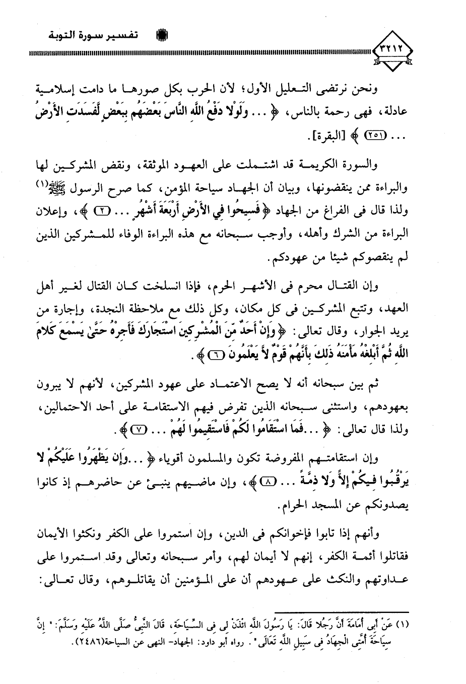 وإن القتال محرم في الأشهر الحرم، فإذا انسلخت كان القتال لغير أهل العهد، وتتبع المشركين في كل مكان، وكل ذلك مع ملاحظة النجدة، وإجارِة من يريد الجوار، وقال تعالى: (وَإِنْ أَحَدٌ مِنَ الْمُشْرِكِينَ اسْتَجَارَكَ فَأَجِرْهُ حَتَّى يَسْمَعَ كَلَامَ اللَّهِ ثُمَّ أَبْلِغْهُ مَأْمَنَهُ ذَلِكَ بِأَنَّهُمْ قَوْمٌ لَا يَعْلَمُونَ (6).