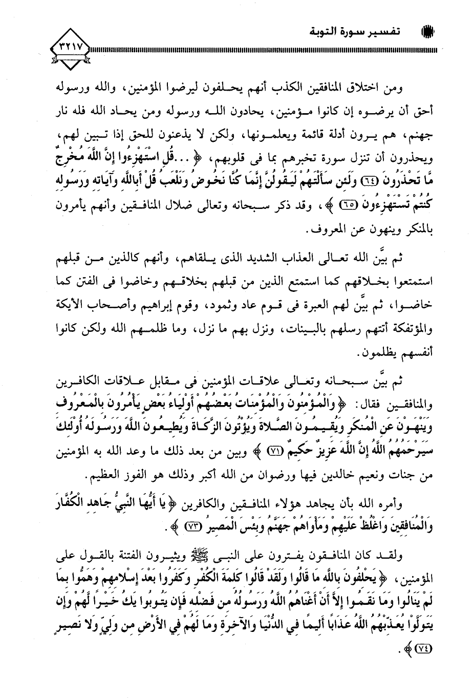 ثم بين سبحانه وتعالى علاقات المؤمنين في مقابل علاقات الكافرين وِالمنافقين فقال: (وَالْمُؤْمِنَاتُ بَعْضُهُمْ أَوْلِيَاءُ بَعْضٍ يَأْمُرُونَ بِالْمَعْرُوفِ وَيَنْهَوْنَ عَنِ الْمُنْكَرِ وَيُقِيمُونَ الصَّلَاةَ وَيُؤْتُونَ الزَّكَاةَ وَيُطِيعُونَ اللَّهَ وَرَسُولَهُ أُولَئِكَ سَيَرْحَمُهُمُ اللَّهُ إِنَّ اللَّهَ عَزِيزٌ حَكِيمٌ (71).