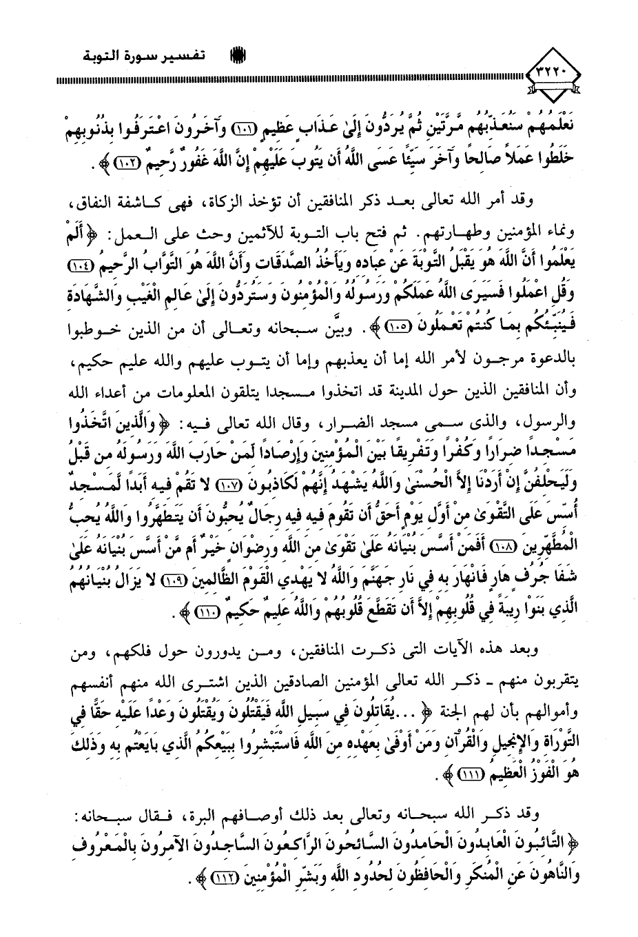 (التَّائِبُونَ الْعَابِدُونَ الْحَامِدُونَ السَّائِحُونَ الرَّاكِعُونَ السَّاجِدُونَ الْآمِرُونَ بِالْمَعْرُوفِ وَالنَّاهُونَ عَنِ الْمُنْكَرِ وَالْحَافِظُونَ لِحُدُودِ اللَّهِ وَبَشِّرِ الْمُؤْمِنِينَ (112).