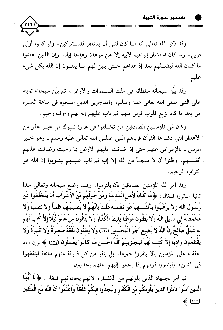 وقد أمر الله المؤمنين الصادقين بأن يلتزِموا. وقد وضع سبحانه وتعالى مبدأ ثانيا مقررا فقال: (مَا كَانَ لِأَهْلِ الْمَدِينَةِ وَمَنْ حَوْلَهُمْ مِنَ الْأَعْرَابِ أَنْ يَتَخَلَّفُوا عَنْ رَسُولِ اللَّهِ وَلَا يَرْغَبُوا بِأَنْفُسِهِمْ عَنْ نَفْسِهِ ذَلِكَ بِأَنَّهُمْ لَا يُصِيبُهُمْ ظَمَأٌ وَلَا نَصَبٌ وَلَا مَخْمَصَةٌ فِي سَبِيلِ اللَّهِ وَلَا يَطَئُونَ مَوْطِئًا يَغِيظُ الْكُفَّارَ وَلَا يَنَالُونَ مِنْ عَدُوٍّ نَيْلًا إِلَّا كُتِبَ لَهُمْ بِهِ عَمَلٌ صَالِحٌ إِنَّ اللَّهَ لَا يُضِيعُ أَجْرَ الْمُحْسِنِينَ (120) وَلَا يُنْفِقُونَ نَفَقَةً صَغِيرَةً وَلَا كَبِيرَةً وَلَا يَقْطَعُونَ وَادِيًا إِلَّا كُتِبَ لَهُمْ لِيَجْزِيَهُمُ اللَّهُ أَحْسَنَ مَا كَانُوا يَعْمَلُونَ (121).
