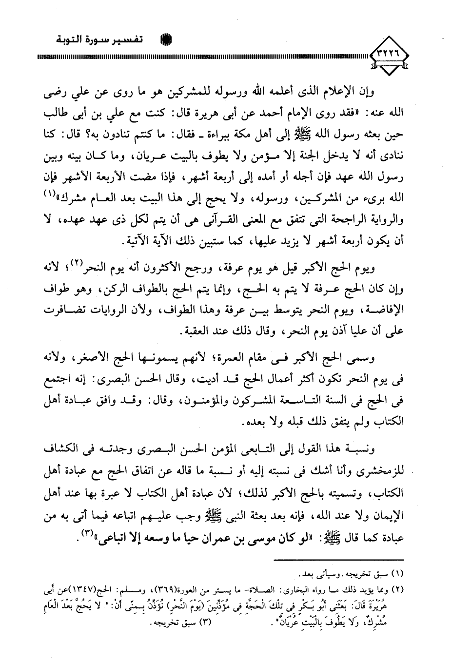ونسبة هذا القول إلى التابعي المؤمن الحسن البصري وجدته في الكشاف للزمخشري وأنا أشك في نسبته إليه أو نسبة ما قاله عن اتفاق الحج مع عبادة أهل الكتاب، وتسميته بالحج الأكبر لذلك؛ لأن عبادة أهل الكتاب لَا عبرة بها عند أهل الإيمان ولا عند الله، فإنه بعد بعثة النبي - صلى الله عليه وسلم - وجب عليهم اتباعه فيما أتى به من عبادة كما قال - صلى الله عليه وسلم -: " لو كان موسى بن عمران حيًّا ما وسعه إلا اتباعي " (¬3).