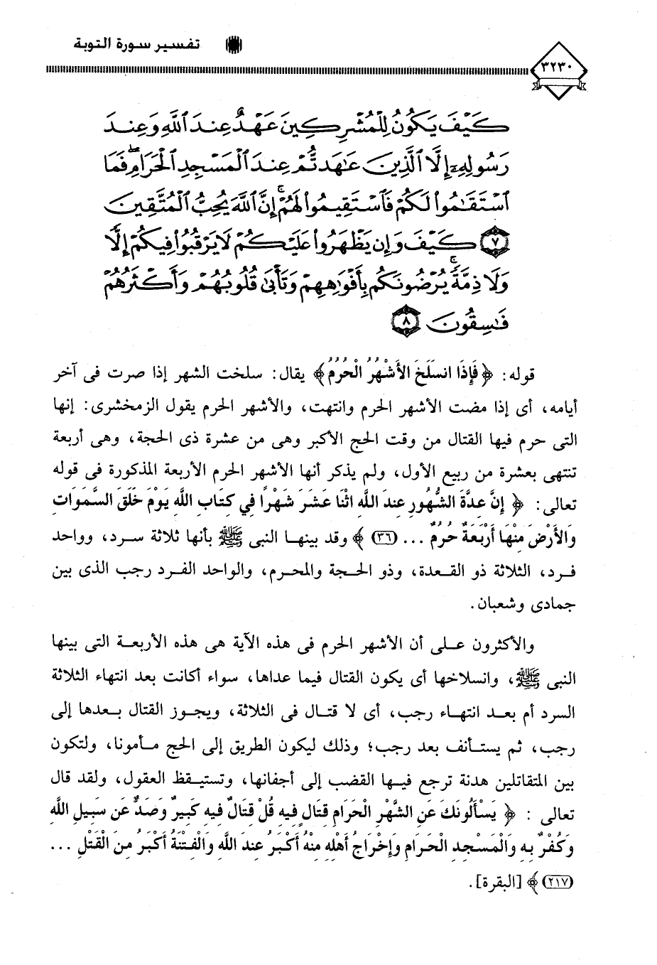 والأكثرون على أن الأشهر الحرم في هذه الآية هي هذه الأربعة التي بينها النبي - صلى الله عليه وسلم -، وانسلاخها أي يكون القتال فيما عداها، سواء أكانت بعد انتهاء الثلاثة السرد أم بعد انتهاء رجب، أي لَا قتال في الثلاثة، ويجوز القتال بعدها إلى رجب، ثم يستأنف بعد رجب؛ وذلك ليكون الطريق إلى الحج مأمونا، ولتكون بين المتقاتلين هدنة ترجع فيها القضب إلى أجفانها، وتستيقظ العقول، ولقد قال تعالى: (يَسْأَلُونَكَ عَنِ الشَّهْرِ الْحَرَامِ قِتَالٍ فِيهِ قُلْ قِتَالٌ فِيهِ كَبِيرٌ وَصَدٌّ عَنْ سَبِيلِ اللَّهِ وَكُفْرٌ بِهِ وَالْمَسْجِدِ الْحَرَامِ وَإِخْرَاجُ أَهْلِهِ مِنْهُ أَكْبَرُ عِنْدَ اللَّهِ وَالْفِتْنَةُ أَكْبَرُ مِنَ الْقَتْلِ. . .).