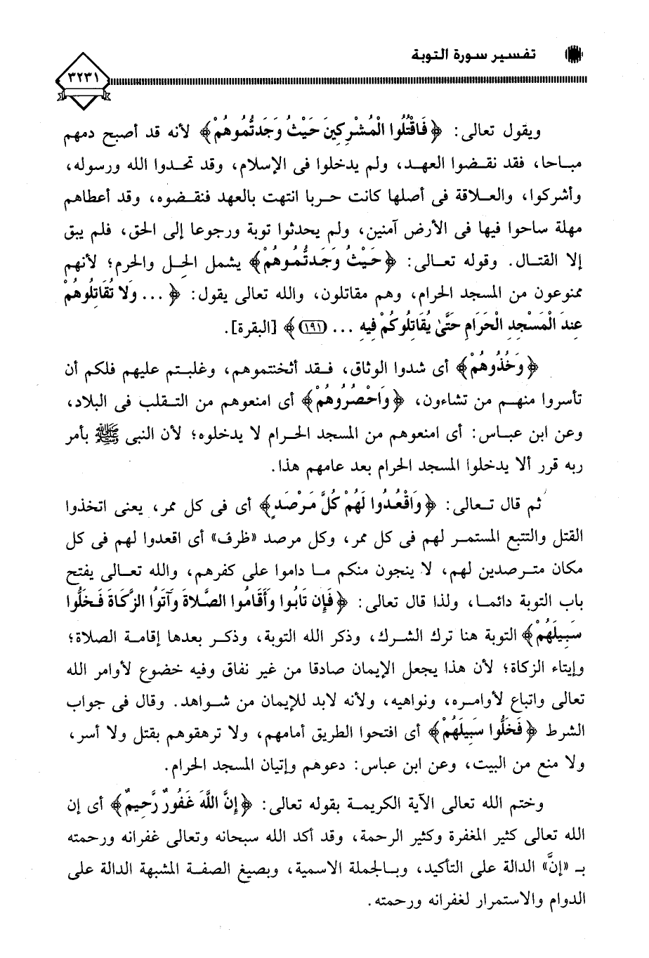 ثم قال تعالى: (وَاقْعُدُوا لَهُمْ كُلَّ مَرْصَدٍ) أي في كل ممر، يعني اتخذوا القتل والتتبع المستمر لهم في كل ممر، وكل مرصد " ظرف " أي اقعدوا لهم في كل مكان مترصدين لهم، لَا ينجون منكم ما داموا على كفرهم، والله تعالى يفتح باب التوبة دائما، ولذا قال تعالى: (فَإِنْ تَابُوا وَأَقَامُوا الصَّلَاةَ وَآتَوُا الزَّكَاةَ فَخَلُّوا سَبِيلَهُمْ) التوبة هنا ترك الشرك، وذكر الله التوبة، وذكر بعدها إقامة الصلاة؛ وإيتاء الزكاة؛ لأن هذا - يجعل الإيمان صادقا من غير نفاق وفيه خضوع لأوامر الله تعالى واتباع لأوامره، ونواهيه، ولأنه لابد للإيمان من شواهد. وقال في جواب الشرط (فَخَلُّوا سَبِيلَهُمْ) أي افتحوا الطريق أمامهم، ولا ترهقوهم بقتل ولا أسر، ولا منع من البيت، وعن ابن عباس: دعوهم وإتيان المسجد الحرام.
