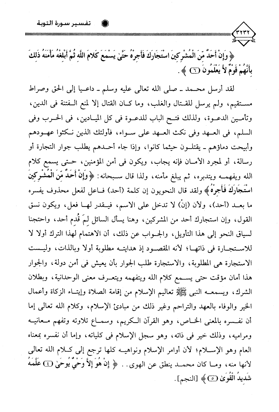 لقد أرسل محمد - صلى الله تعالى عليه وسلم - داعيا إلى الحق وصراط مستقيم، ولم يرسل للقتال والغلب، وما كان القتال إلا لمنع الفتنة في الدين، وتأمين الدعوة، ولذلك فتح الباب للدعوة في كل الميادين، في الحرب وفي السلم، في العهد وفي نكث العهد على سواء، فأولئك الذين نكثوا عهودهم وأبيحت دماؤهم - يقتلون حيثما كانوا، وإذا جاء أحدهم يطلب جوار التجارة أو رسالة، أو لمجرد الأمان فإنه يجاب، ويكون في أمن المؤمنين، حتى يسمع كلام الله ويفهمه ويتدبره، ثم يبلغ مأمنه، ولذا قال سبحانه: (وَإِنْ أَحَدٌ مِنَ الْمُشْرِكِينَ اسْتَجَارَكَ فَأَجِرْهُ) ولقد قال النحويون إن كلمة (أحد) فاعل لفعل محذوف يفسره ما بعد (أحد)، ولأن (إنْ) لَا تدخل على الاسم، فيقدر لها فعل، ويكون نسق القول، وإن استجارك أحد من المشركين، وهنا يسأل السائل لِمَ قُدِم أحد، واحتجنا لسياق النحو إلى هذا التأويل؟ والجواب عن ذلك، أن الاهتمام لهذا الترك أولا لا للاستجارة في ذاتها؛ لأنه المقصود إذ هدايته مطلوبة أولا وبالذات، وليست الاستجارة هي المطلوبة، والاستجارة طلب الجوار بأن يعيش في أمن دولة، والجوار هذا أمان مؤقت حتى يسمع كلام الله ويتفهمه ويتعرف معنى الوحدانية، وبطلان الشرك، ويسمعه النبي - صلى الله عليه وسلم - تعاليم الإسلام من إقامة الصلاة وإيتاء الزكاة وأعمال الخير والوفاء بالعهد والتراحم وغير ذلك من مبادئ الإسلام، وكلام الله تعالى إما أن نفسره بالمعنى الخاص، وهو القرآن الكريم، وسماع تلاوته وتفهم معانيه ومراميه، وذلك خير في ذاته، وهو سجل الإسلام في كلياته، وإما أن نفسره بمعناه العام وهو الإسلام؛ لأن أوامر الإسلام ونواهيه كلها ترجع إلى كلام الله تعالى لأنها منه، وما كان محمد ينطق عن الهوى. . (إِنْ هُوَ إِلَّا وَحْيٌ يُوحَى (4) عَلَّمَهُ شَدِيدُ الْقُوَى (5).