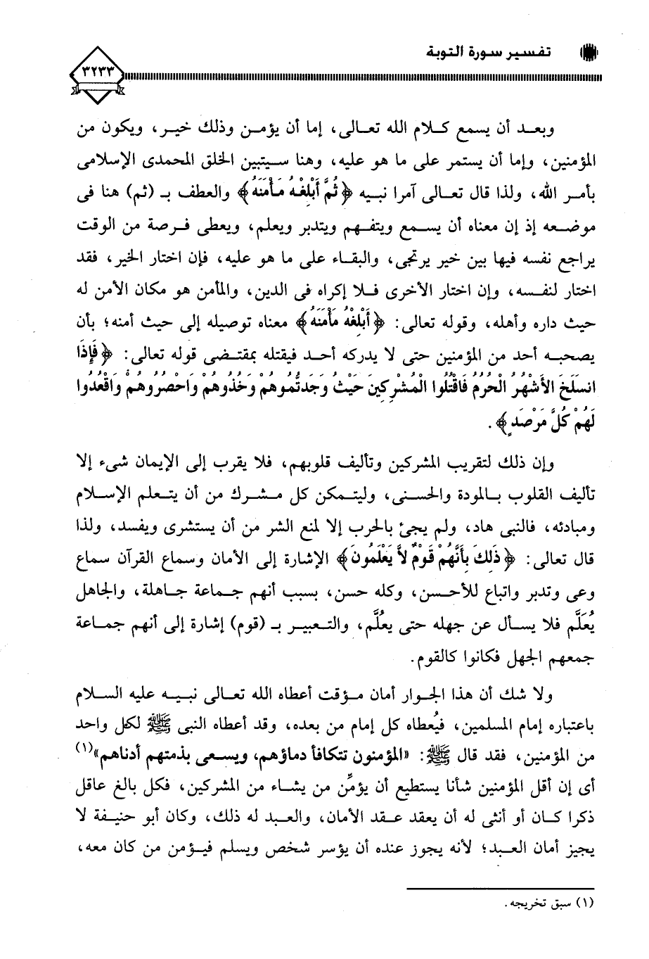 وبعد أن يسمع كلام الله تعالى، إما أن يؤمن وذلك خير، ويكون من المؤمنين، وإما أن يستمر على ما هو عليه، وهنا سيتبين الخلق المحمدي الإسلامي بأمر الله، ولذا قال تعالى آمرا نبيه (ثُمَّ أَبْلِغْهُ مَأْمَنَهُ) والعطف بـ (ثم) هنا في موضعه إذ إن معناه أن يسمع ويتفهم ويتدبر ويعلم، ويعطي فرصة من الوقت يراجع نفسه فيها بين خير يرتجى، والبقاء على ما هو عليه، فإن اختار الخير، فقد اختار لنفسه، وإن اختار الأخرى فلا إكراه في الدين، والمأمن هو مكان الأمن له حيث داره وأهله، وقوله تعالى: (أَبْلِغْهُ مَأْمَنَهُ) معناه توصيله إلى حيث أمنه؛ بأن يصحبه أحد من المؤمنين حتى لَا يدركه أحد فيقتله بمقتضى قوله تعالى (فَإِذَا انْسَلَخَ الْأَشْهُرُ الْحُرُمُ فَاقْتُلُوا الْمُشْرِكِينَ حَيْثُ وَجَدْتُمُوهُمْ وَخُذُوهُمْ وَاحْصُرُوهُمْ وَاقْعُدُوا لَهُمْ كُلَّ مَرْصَدٍ).