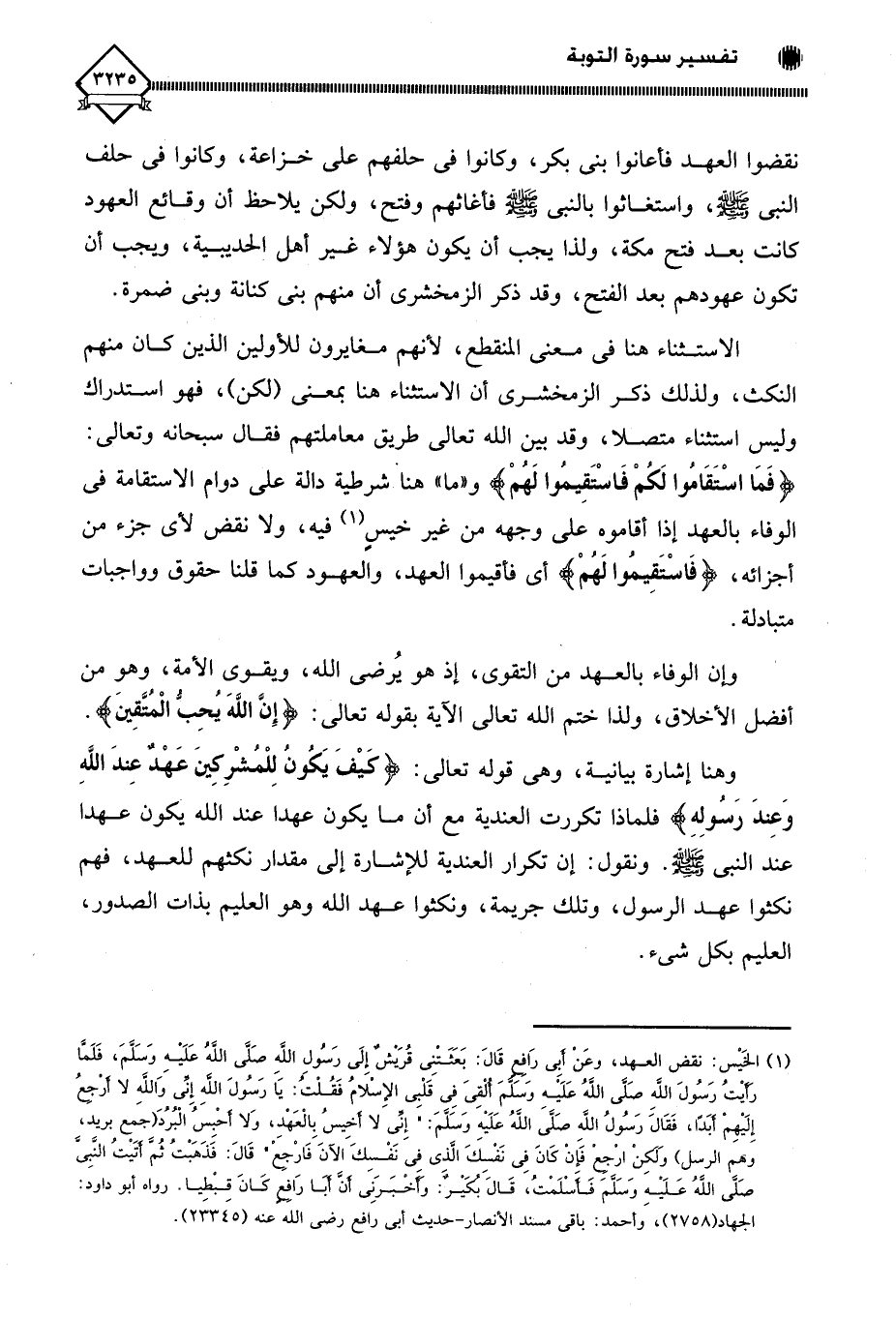 وهنا إشارة بيانية، وهي قوله تعالى: (كَيْفَ يَكُون لِلْمُشْرِكِينَ عَهْدٌ عِندَ اللَّهِ وَعِندَ رَسُولِهِ) فلماذا تكررت العندية مع أن ما يكون عهدا عند الله يكون عهدا عند النبي - صلى الله عليه وسلم -. ونقول: إن تكرار العندية للإشارة إلى مقدار نكثهم للعهد، فهم نكثوا عهد الرسول، وتلك جريمة، ونكثوا عهد الله وهو العليم بذات الصدور، العليم بكل شيء.