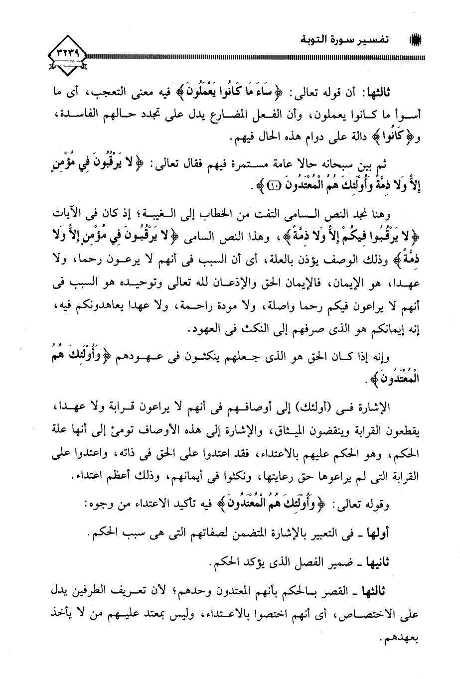 ثالثها - القصر بالحكم بأنهم المعتدون وحدهم؛ لأن تعريف الطرفين يدل على الاختصاص، أي أنهم اختصوا بالاعتداء، وليس بمعتد عليهم من لَا يأخذ بعهدهم.
