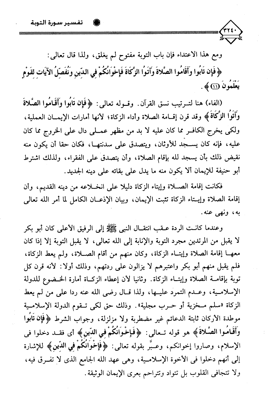 وعندما كانت الردة عقب انتقال النبي - صلى الله عليه وسلم - إلى الرفيق الأعلى كان أبو بكر لا يقبل من المرتدين مجرد التوبة والإنابة إلى الله تعالى، لَا يقبل التوبة إلا إذا كان معها إقامة الصلاة وإيتاء الزكاة، وكان منهم من أقام الصلاة، ولم يعط الزكاة، فلم يقبل منهم أبو بكر واعتبرهم لَا يزالون على ردتهم، وذلك أولا: لأنه قرن كل توبة بإقامة الصلاة وإيتاء الزكاة. وثانيا لأن إعطاء الزكاة أمارة الخضوع للدولة الإسلامية، وعدم التمرد عليها، ولذا قال رضي الله عنه ردا على من لم يعط الزكاة " سلم مخزية أو حرب مجلية ". وذلك حق لكي تقوم الدولة الإسلامية موطدة الأركان ثابتة الدعائم غير مضطربة ولا مزلزلة، وجواب الشرط (فَإِنْ تَابُوا وَأَقَامُوا الصَّلَاةَ) هو قوله تعالى: (فَإِخْوَانُكُمْ فِي الدِّينِ) أي فقد دخلوا في الإسلام، وصاروا إخوانكم، وعبَر بقوله تعالى: (فَإِخْوَانُكُمْ فِي الدِّينِ) للإشارة إلى أنهم دخلوا في الأخوة الإسلامية، وهي عهد الله الجامع الذي لَا تفرق فيه، ولا تتجافى القلوب بل تتواد وتتراحم بعرى الإيمان الوثيقة.