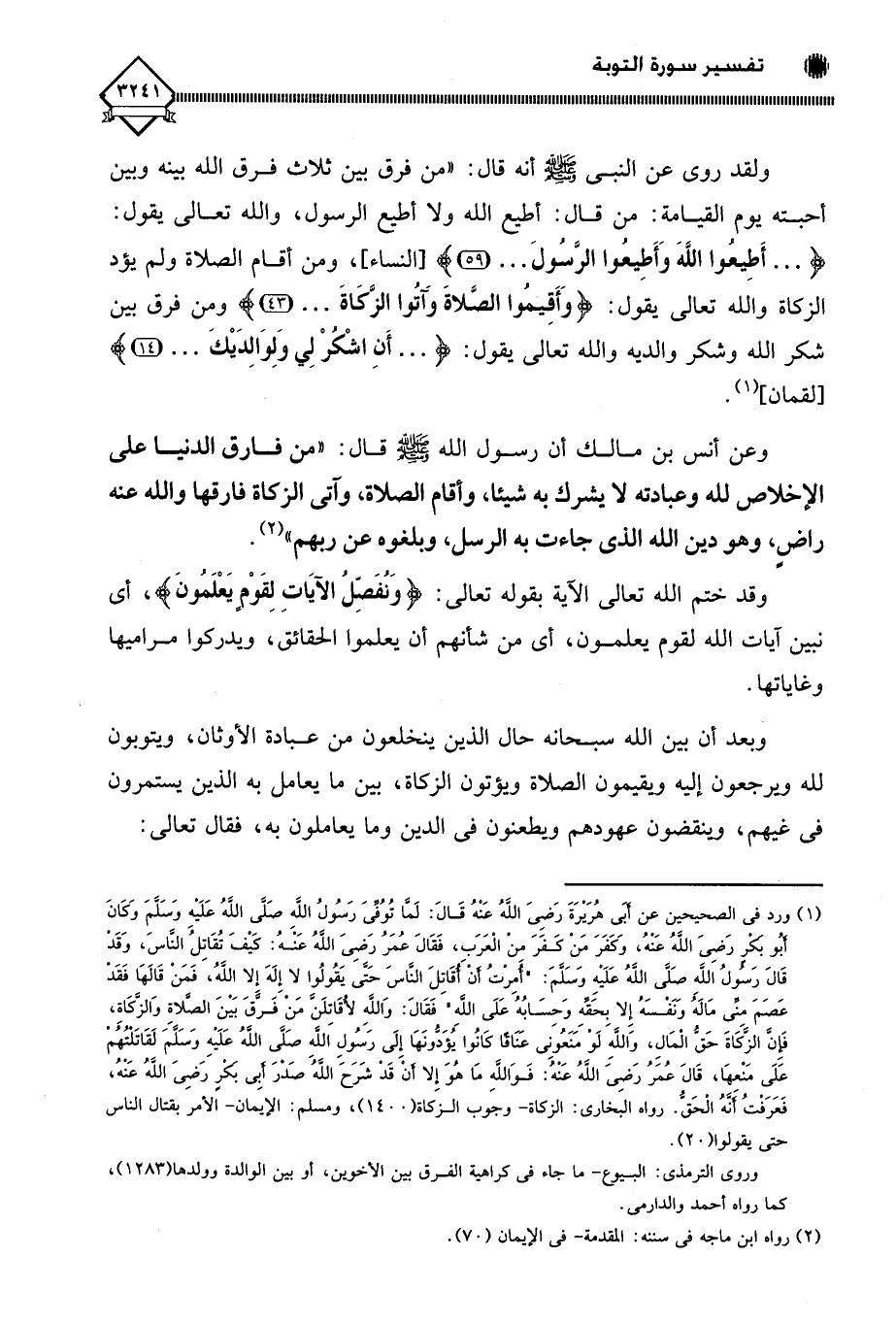 (. . . أَطِيعُوا اللَّهَ وَأَطِيعُوا الرَّسُولَ. . .)، ومن أقام الصلاة ولم يؤد الزكاة والله تعالى يقول: (وَأَقِيمُوا الصَّلاةَ وَآتُوا الزَّكَاةَ. . .) ومن فرق بين شكر الله وشكر والديه والله تعالى يقول: (. . . أَنِ اشْكُرْ لِي وَلِوَالِدَيْكَ. . .) ألقمان، (¬1).