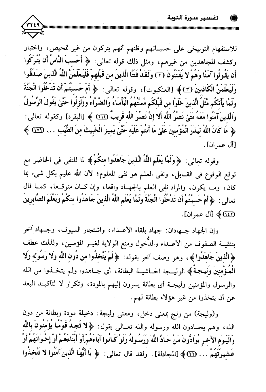 وإن الجهاد جهادان: جهاد بلقاء الأعداء، واشتجار السيوف، وجهاد آخر بتنقية الصفوف من الأعداء والدُّخول ومنع الولاية لغير المؤمنين، ولذلك عطف (الَّذِينَ جَاهَدُوا)، وهو وصف آخر بقوله: (لَمْ يَتَّخِذُوا مِن دُونِ اللَّهِ وَلا رَسُولِهِ وَلا الْمُؤْمِنِينَ وَلِيجَةً) الولج الحاشية البطانة، أي جاهدوا ولم يتخذوا من الله والرسول والمؤمنين وليجة أي بطانة يسرون إليهم بالمودة، وتكرار لَا لتأكيد البعد عن أن يتخذوا من غير هؤلاء بطانة لهم.