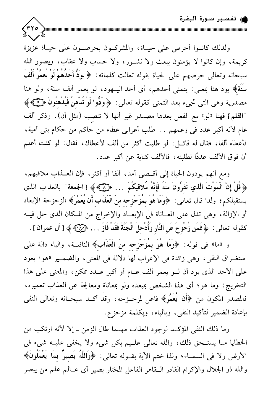 ولذلك كانوا أحرص على حياة، والمشركون يحرصون على حياة عزيزة كريمة، وإن كانوا لَا يؤمنون ببعث ولا نشور، ولا حساب ولا عقاب، ويصور الله سبحانه وتعالى حرصهم على الحياة بقوله تعالت كلماته: (يَوَدُّ أَحَدُهُمْ لَوْ يُعَمَرُ أَلْفَ سَنَةٍ) يود هنا بمعنى: يتمنى أحدهم، أي أحد اليهود، لو يعمر ألف سنة، ولو هنا مصدرية وهي التي تجيء بعد التمني كقوله تعالى: (وَدُّوا لَوْ تُدْهِنُ فَيُدْهِنُونَ)، فهنا " لو " مع الفعل بعدها مصدر غير أنها لَا تنصِب (مثل أن). وذكر ألف عام لأنه أكبر عدد في زعمهم. . طلب أعرابي عطاء من حاكم من حكام بني أمية، فأعطاه ألفا، فقال له قائل: لو طلبت أكثر من ألف لأعطاك، فقال: لو كنت أعلم أن فوق الألف عددًا لطلبته، فالألف كناية عن أكبر عدد.