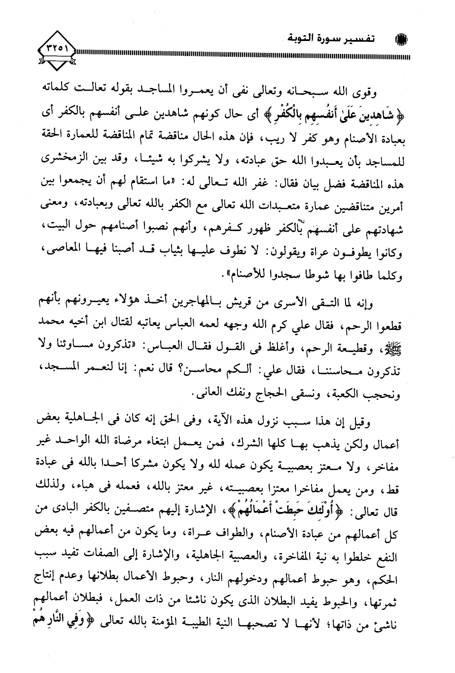 وقوى الله سبحانه وتعالى نفي أن يعمروا المساجد بقوله تعالت كلماته (شَاهِدِينَ عَلَى أَنفُسِهِم بِالْكُفْرِ) أي حال كونهم شاهدين على أنفسهم بالكفر أي بعبادة الأصنام وهو كفر لَا ريب، فإن هذه الحال مناقضة تمام المناقضة للعمارة الحقة للمساجد بأن يعبدوا الله حق عبادته، ولا يشركوا به شيئا، وقد بين الزمخشري هذه الناقضة فضل بيان فقال: غفر الله تعالى له: " ما استقام لهم أن يجمعوا بين أمرين متناقضين عمارة متعبدات الله تعالى مع الكفر بالله تعالى وبعبادته، ومعنى شهادتهم على أنفسهم بالكفر ظهور كفرهم، وأنهم نصبوا أصنامهم حول البيت، وكانوا يطوفون عراة ويقولون: لَا نطوف عليها بثياب قد أصبنا فيها المعاصي، وكلما طافوا بها شوطا سجدوا للأصنام ".