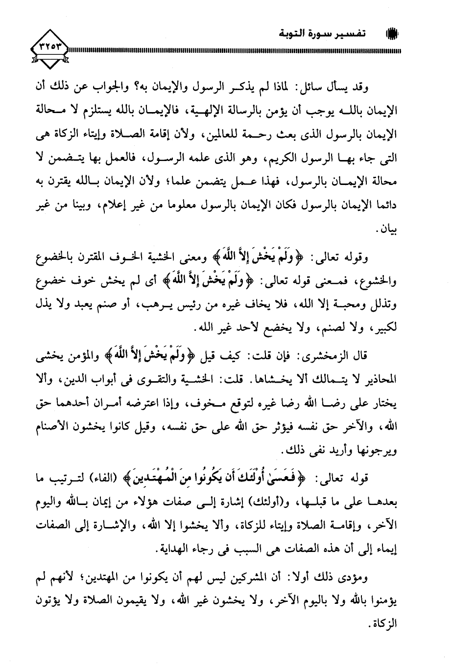 قال الزمخشري: فإن قلت: كيف قيل (وَلَمْ يَخْشَ إِلَّا اللَّهَ) والمؤمن يخشى المحاذير لَا يتمالك ألا يخشاها. قلت: الخشية والتقوى في أبواب الدين، وألا يختار على رضا الله رضا غيره لتوقع مخوف، وإذا اعترضه أمران أحدهما حق الله، والآخر حق نفسه فيؤثر حق الله على حق نفسه، وقيل كانوا يخشون الأصنام ويرجونها وأريد نفي ذلك.