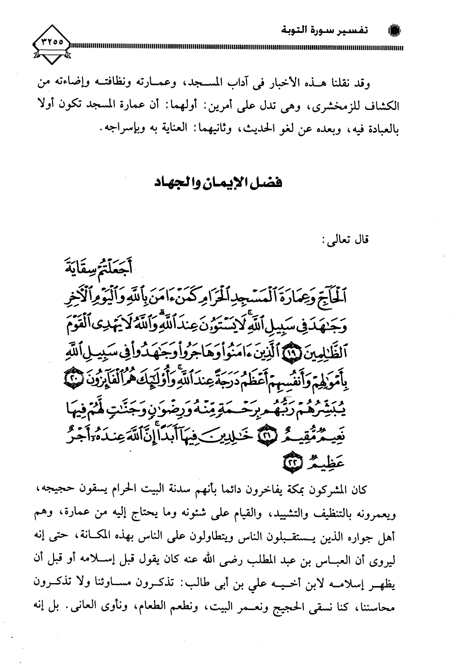 (أَجَعَلْتُمْ سِقَايَةَ الْحَاجِّ وَعِمَارَةَ الْمَسْجِدِ الْحَرَامِ كَمَنْ آمَنَ بِاللَّهِ وَالْيَوْمِ الْآخِرِ وَجَاهَدَ فِي سَبِيلِ اللَّهِ لَا يَسْتَوُونَ عِنْدَ اللَّهِ وَاللَّهُ لَا يَهْدِي الْقَوْمَ الظَّالِمِينَ (19) الَّذِينَ آمَنُوا وَهَاجَرُوا وَجَاهَدُوا فِي سَبِيلِ اللَّهِ بِأَمْوَالِهِمْ وَأَنْفُسِهِمْ أَعْظَمُ دَرَجَةً عِنْدَ اللَّهِ وَأُولَئِكَ هُمُ الْفَائِزُونَ (20) يُبَشِّرُهُمْ رَبُّهُمْ بِرَحْمَةٍ مِنْهُ وَرِضْوَانٍ وَجَنَّاتٍ لَهُمْ فِيهَا نَعِيمٌ مُقِيمٌ (21) خَالِدِينَ فِيهَا أَبَدًا إِنَّ اللَّهَ عِنْدَهُ أَجْرٌ عَظِيمٌ (22)