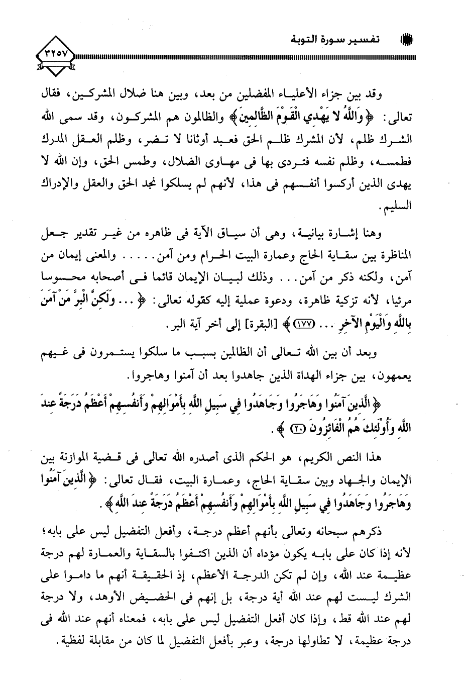 هذا النص الكريم، هو الحكم الذي أصدره الله تعالى في قضية الموازنة بين الإيمان والجهاد وبين سقاية الحاج، وعمارة البيت، فقال تعالى: (الَّذِينَ آمَنُوا وَهَاجَرُوا وَجَاهَدُوا فِي سَبِيلِ اللَّهِ بِأمْوَالِهِمْ وَأَنفُسِهِمْ أَعْظَمُ دَرَجَةً عِندَ اللَّهِ).